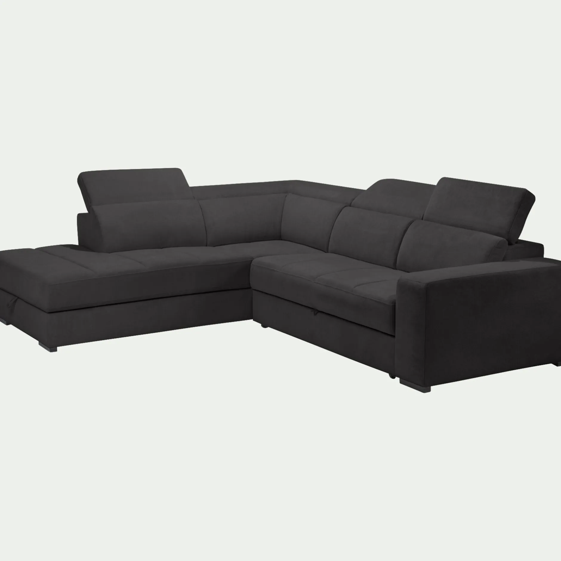 Un superbe canapé d’angle gauche en tissu d’une couleur gris ardoise, idéal pour un grand salon. Ce canapé vous offre un espace détente spacieux et confortable avec son assise capitonnée et ses têtières relevables qui accompagneront tous vos mouvements. Convertible, il met à votre disposition un couchage d’appoint de 130×200 cm avec un matelas de 10 cm d’épaisseur qui se déploie aisément. Pratique et astucieux grâce à son coffre, ce grand canapé allie fonctionnalité, style et confort.