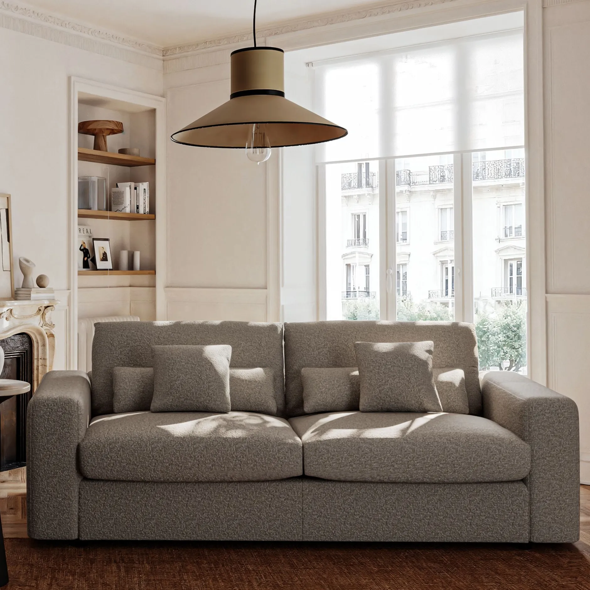 Le canapé Piuma est idéal pour se prélasser dans votre salon. Avec ses grandes assises, ce canapé 5 places fixe en tissu bouclette vous offre un confort exceptionnel. Il vous permet de vous détendre au coeur de coussins moelleux qui vous font sentir dans un nuage de douceur, une sensation renforcée par son tissu délicat. Vous pourrez ainsi recevoir famille et amis à partager des soirées conviviales lors d’un moment apaisant. Ce canapé fixe de couleur gris clair apporte également une touche design moderne et élégante à votre salon. Son tissu bouclette donne un côté cocooning qui vous permet de transformer votre pièce en un espace chaleureux. Piuma fait ainsi rimer confort avec esthétisme et élégance.