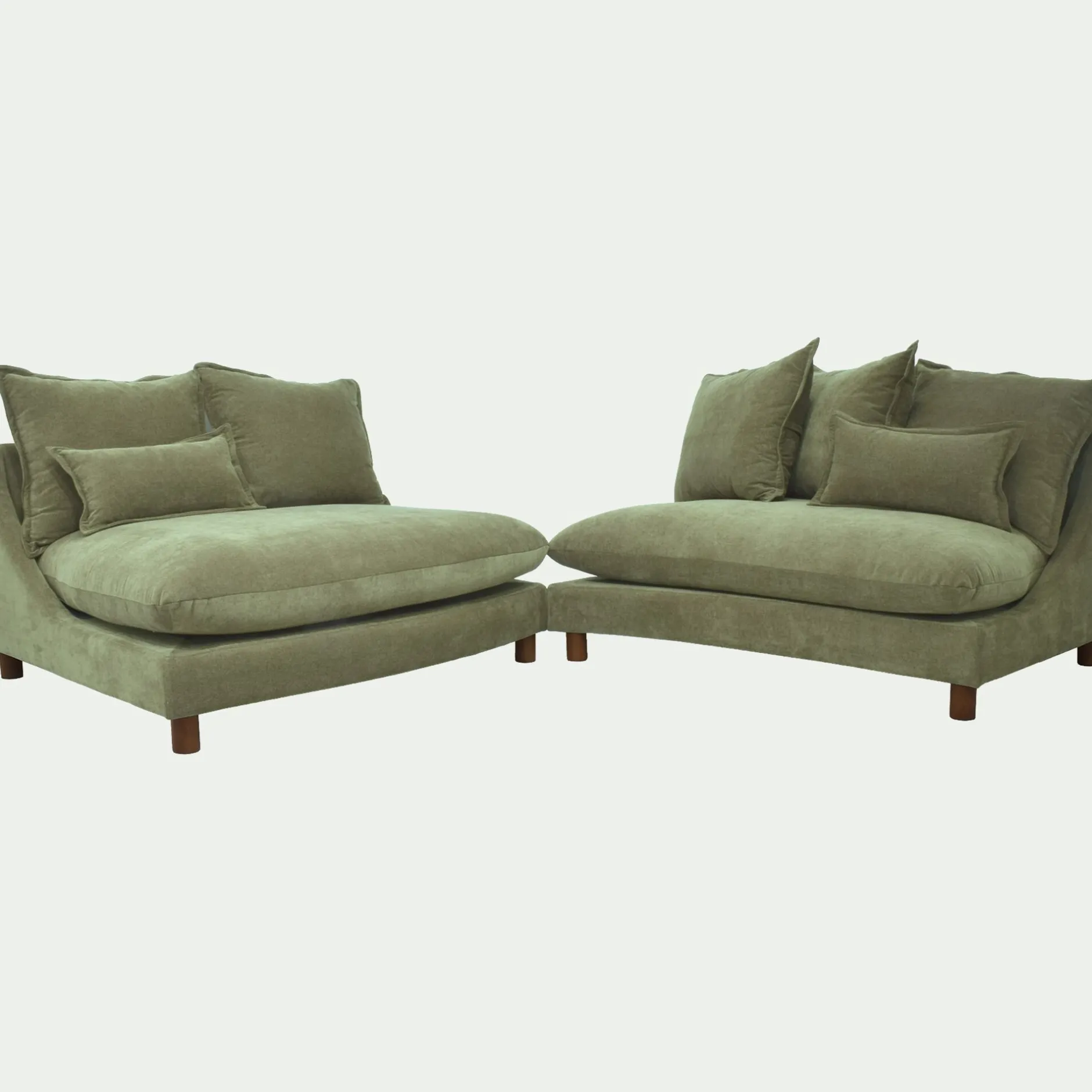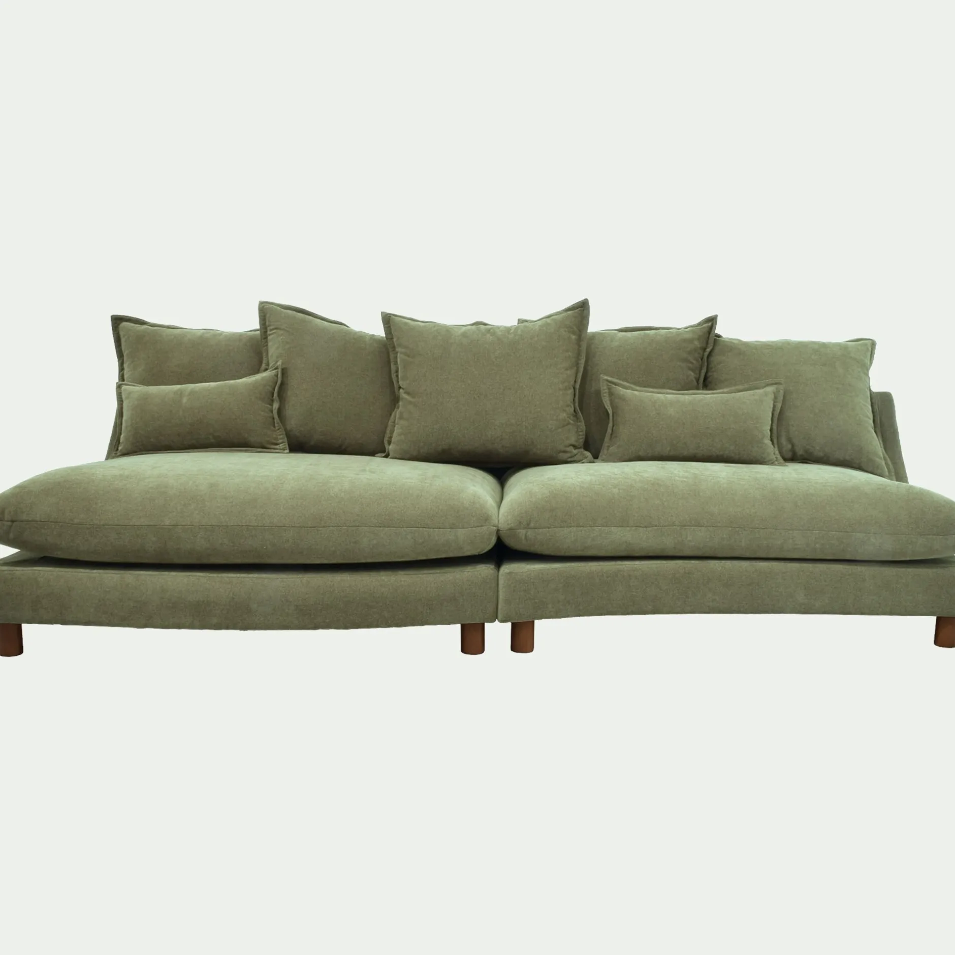 Ce grand canapé modulable séduit par ses lignes généreuses et son design singulier, entre modernité et confort. Entièrement convertible, il se compose de deux modules que l’on peut rapprocher pour former un couchage d’appoint, idéal pour les moments de détente prolongés. Revêtu d’un tissu vert eucalyptus, il apporte une note de fraîcheur douce et naturelle à la pièce. Ses nombreux coussins renforcent l’esprit cocooning et invitent à s’y lover. Fabriqué en France, dans des ateliers situés près de Bourges, ce canapé reflète le savoir-faire d’artisans passionnés. Une pièce de caractère, conçue avec soin, qui incarne l’élégance à la française.