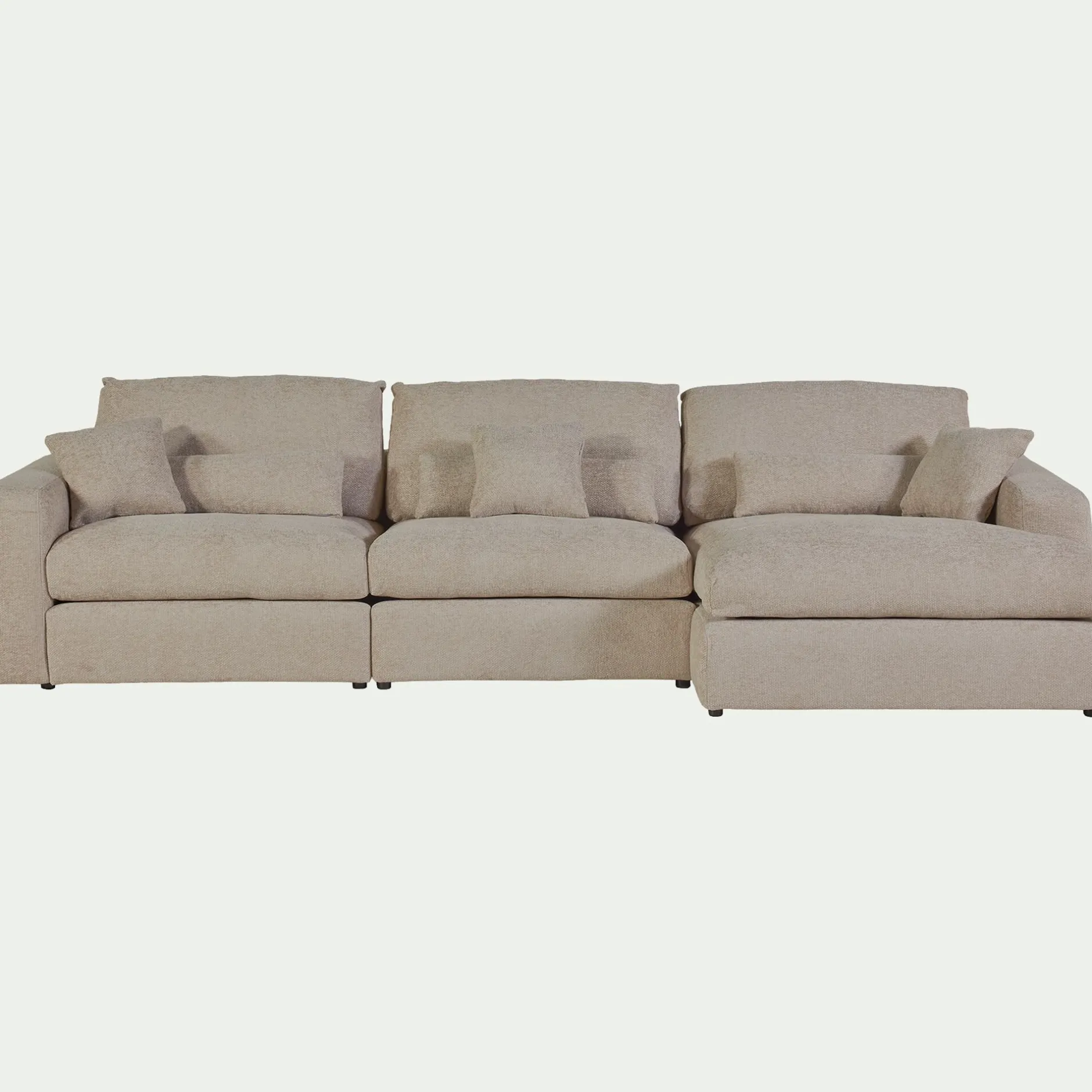 Le canapé Piuma est idéal pour se prélasser dans votre salon. Avec ses grandes assises, ce canapé d’angle droit en tissu chenille vous offre un confort exceptionnel. Il vous permet de vous détendre au coeur de coussins moelleux dans un nuage de douceur renforcé par son tissu délicat. Vous pourrez ainsi recevoir famille et amis lors d’un moment apaisant. Ce canapé fixe de couleur beige roucas apporte également une touche design moderne et élégante à votre salon. Son tissu chenille donne un côté cocooning qui vous permet de transformer votre pièce en un espace chaleureux.