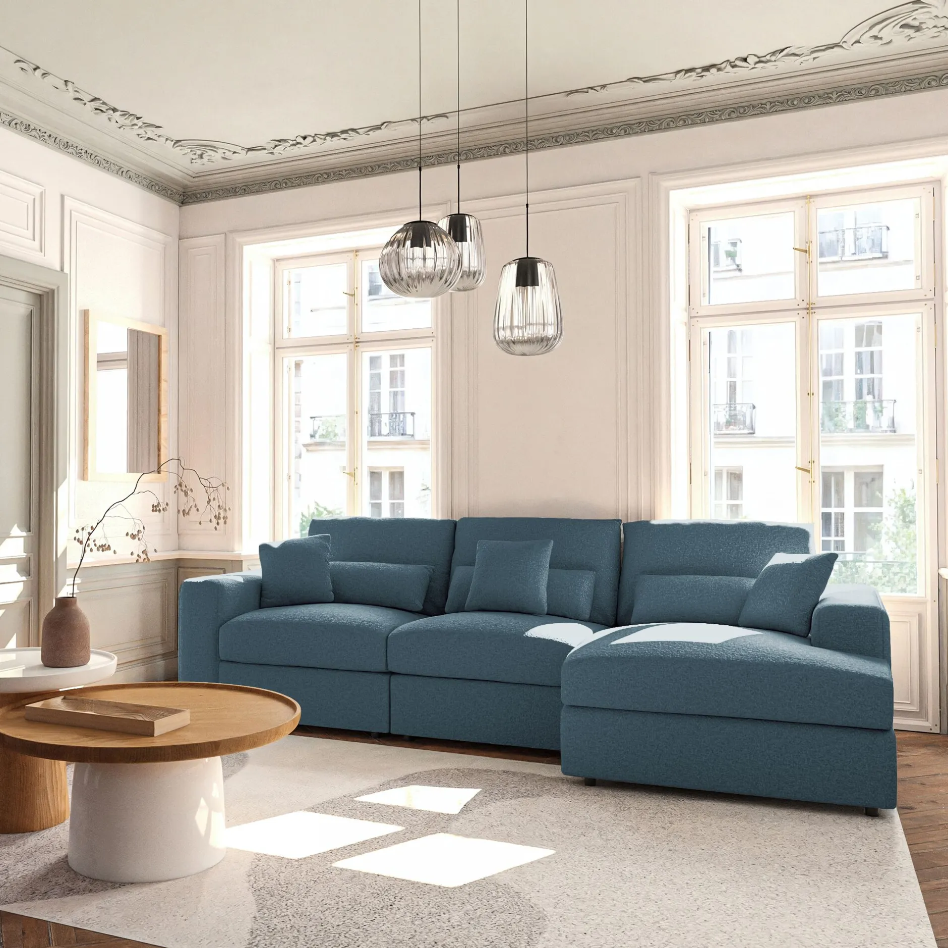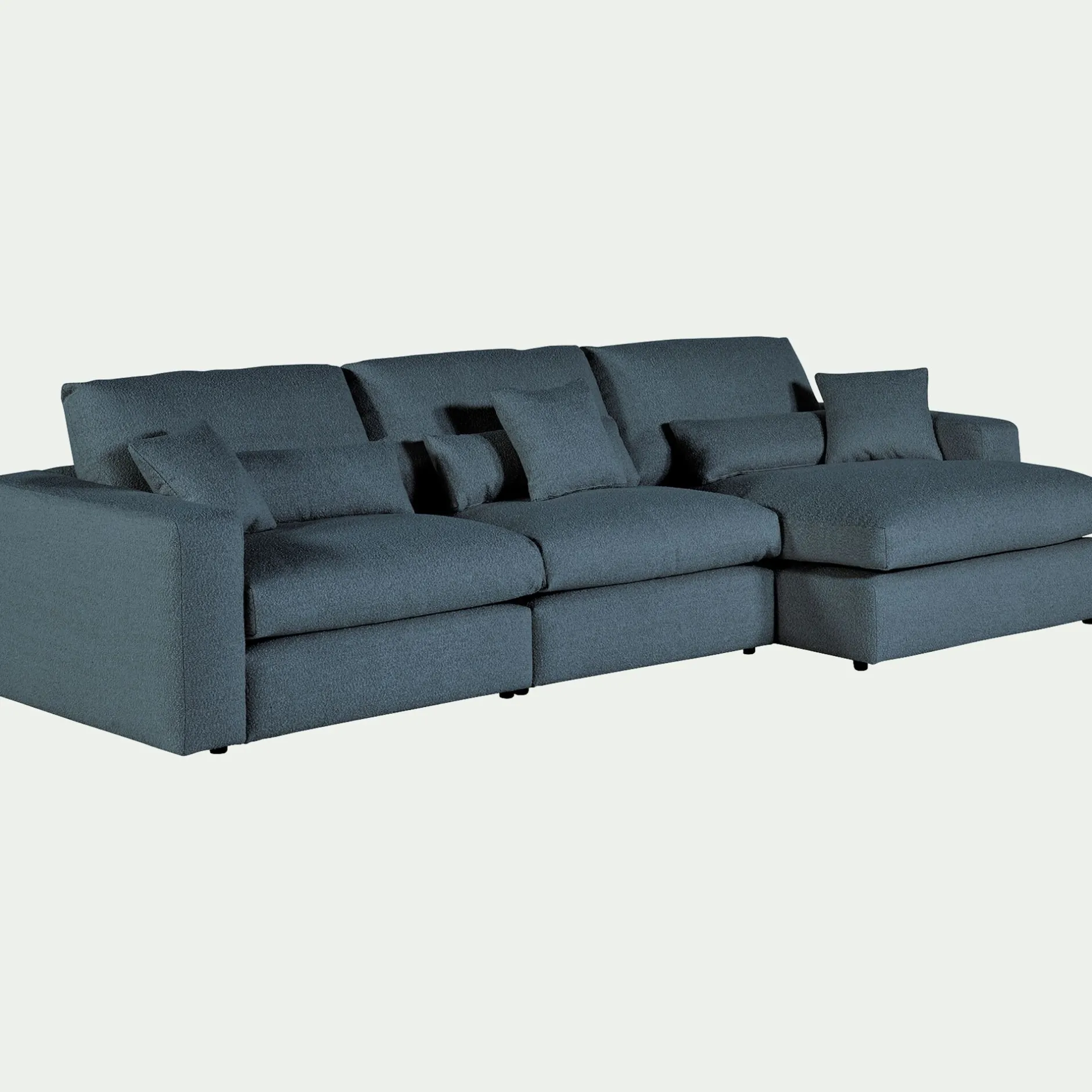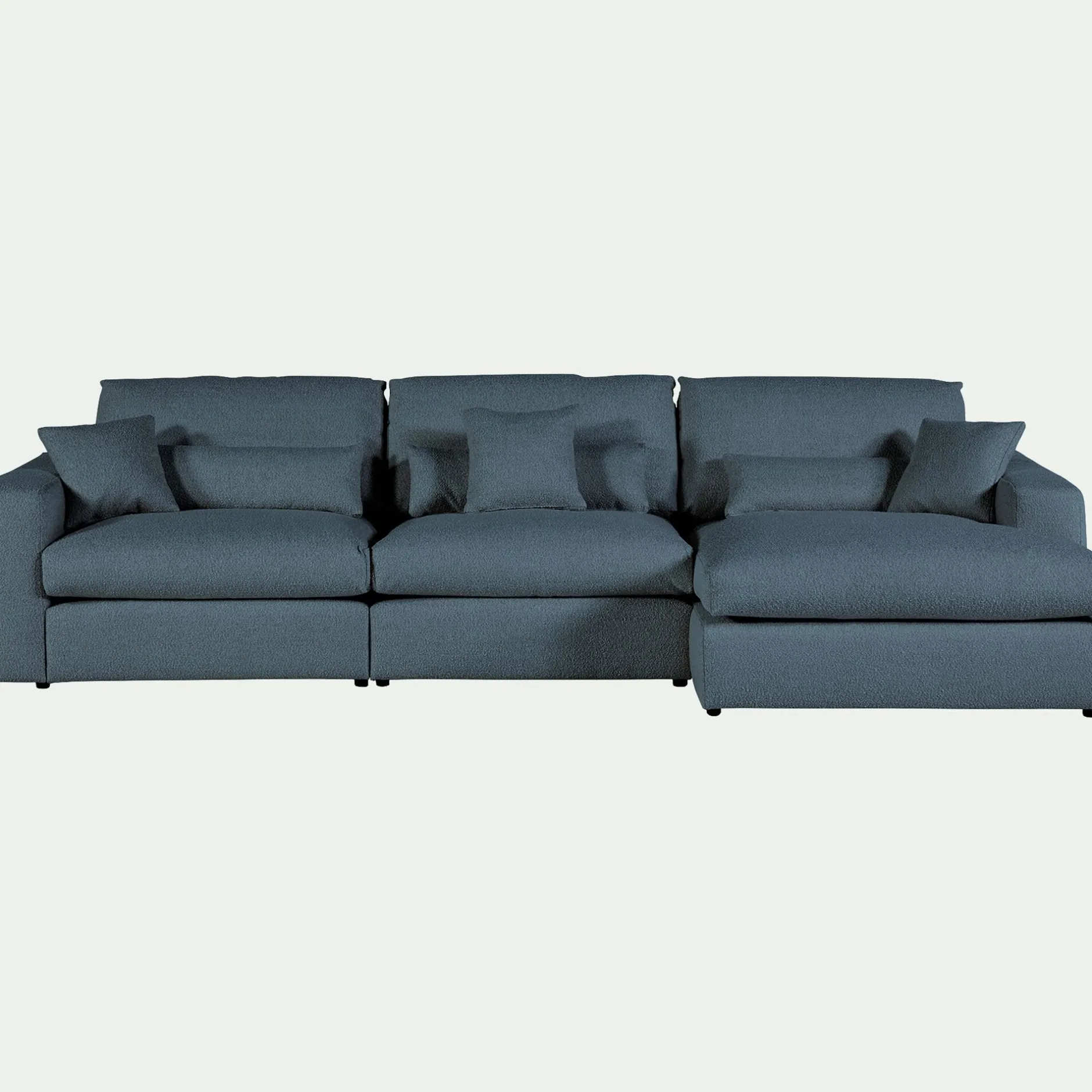 Le canapé Piuma est idéal pour se prélasser dans votre salon. Avec ses grandes assises, ce canapé d’angle droit en tissu bouclette vous offre un confort exceptionnel. Il vous permet de vous détendre au coeur de coussins moelleux dans un nuage de douceur renforcé par son tissu délicat. Vous pourrez ainsi recevoir famille et amis lors d’un moment apaisant. Ce canapé fixe de couleur bleu apporte également une touche design moderne et élégante à votre salon. Son tissu bouclette donne un côté cocooning qui vous permet de transformer votre pièce en un espace chaleureux.