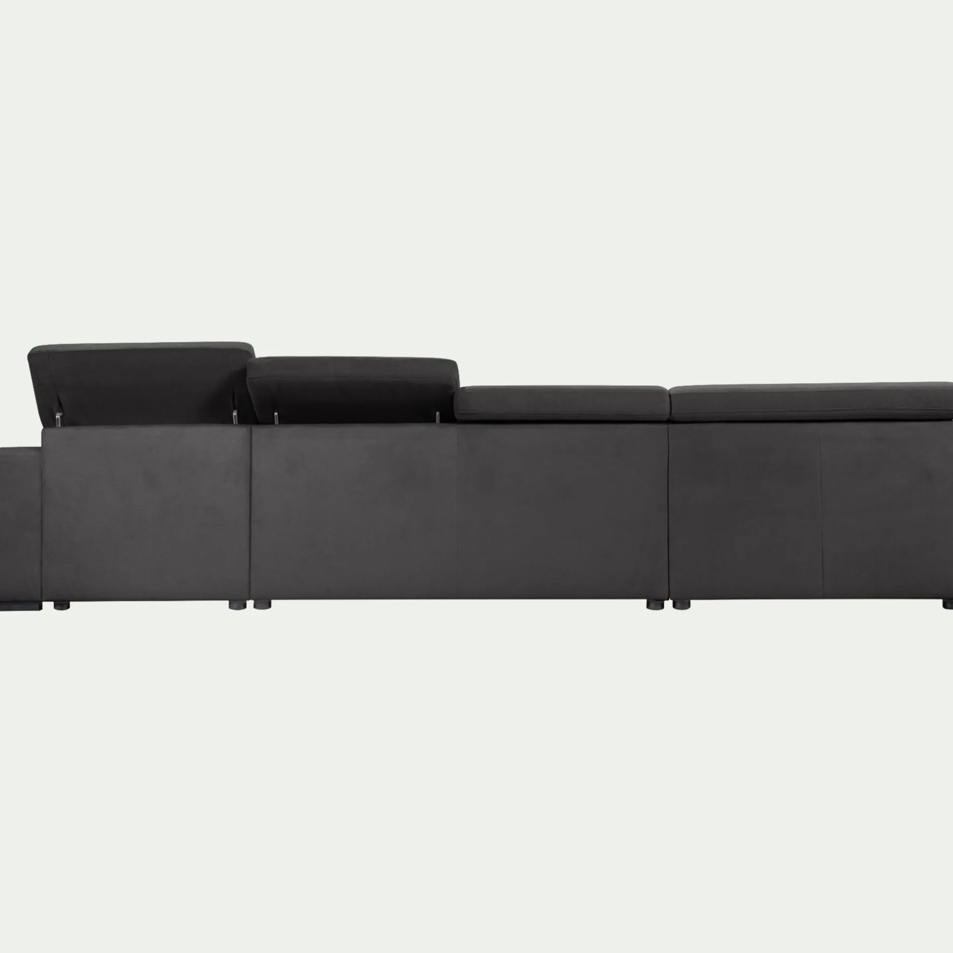 Un superbe canapé en U en tissu d’une couleur gris ardoise, idéal pour un grand salon. Ce canapé vous offre un espace détente spacieux et confortable avec son assise capitonnée et ses têtières relevables qui accompagneront tous vos mouvements. Convertible, il met à votre disposition un couchage d’appoint de 130×200 cm avec un matelas de 10 cm d’épaisseur qui se déploie aisément. Pratique et astucieux grâce à son coffre et sa méridienne droite, ce grand canapé allie fonctionnalité, style et confort.
