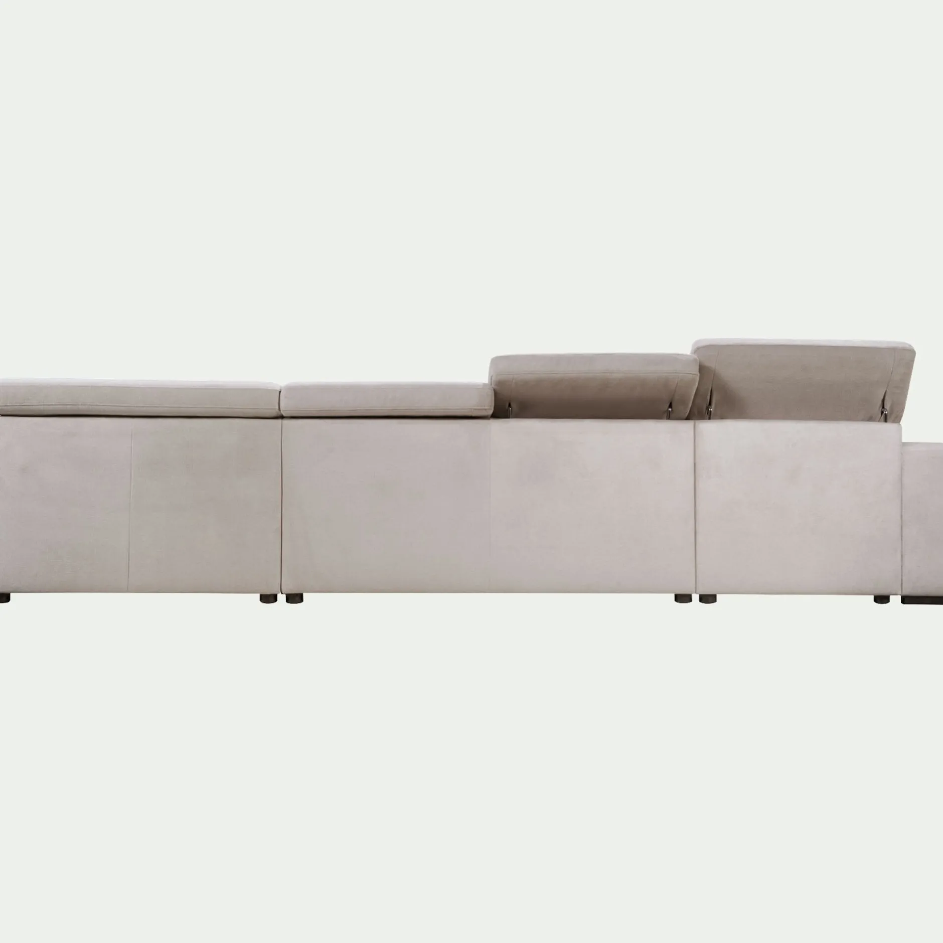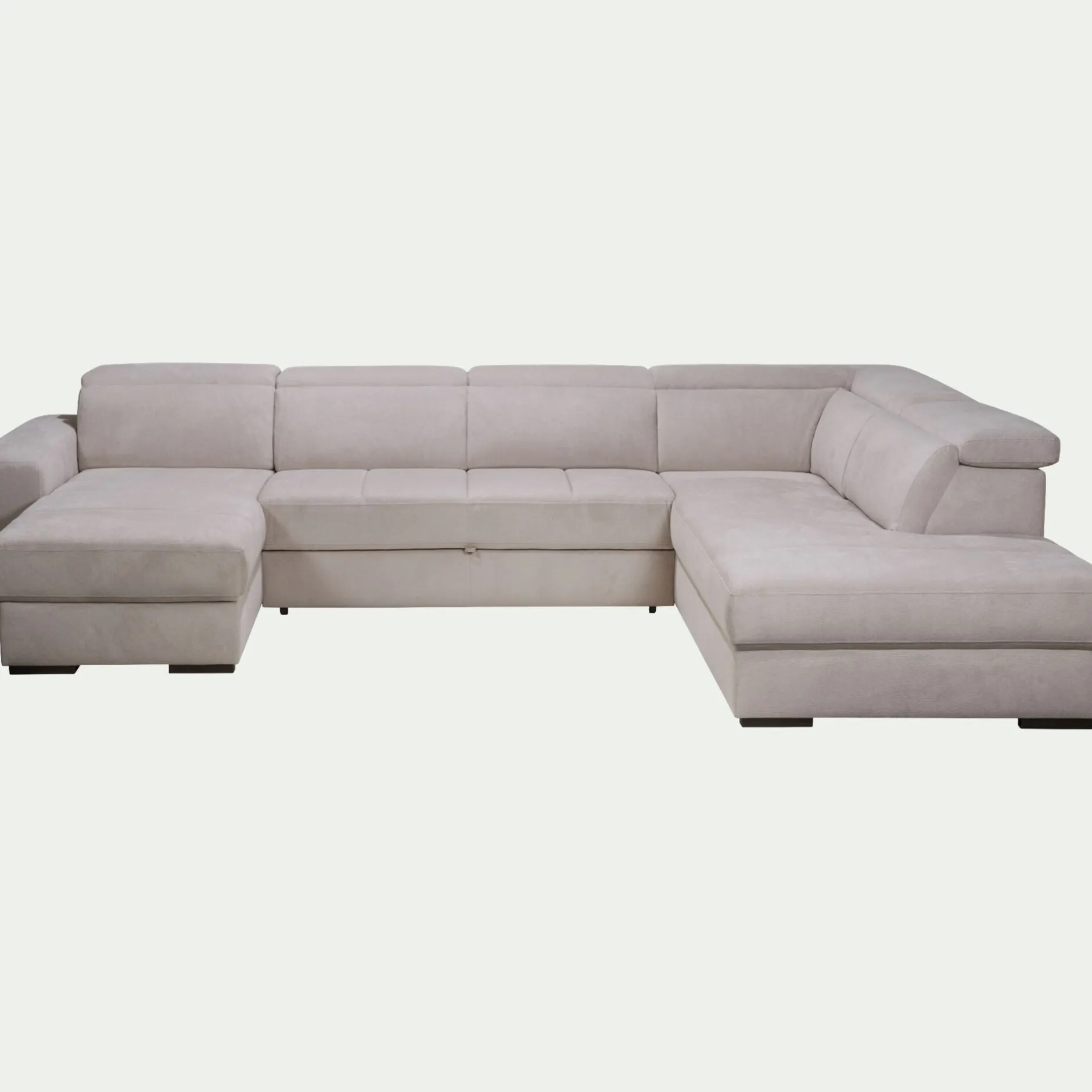 Un superbe canapé en U en tissu d’une couleur beige, idéal pour un grand salon. Ce canapé vous offre un espace détente spacieux et confortable avec son assise capitonnée et ses têtières relevables qui accompagneront tous vos mouvements. Convertible, il met à votre disposition un couchage d’appoint de 130×200 cm avec un matelas de 10 cm d’épaisseur qui se déploie aisément. Pratique et astucieux grâce à son coffre et sa méridienne gauche, ce grand canapé allie fonctionnalité, style et confort.