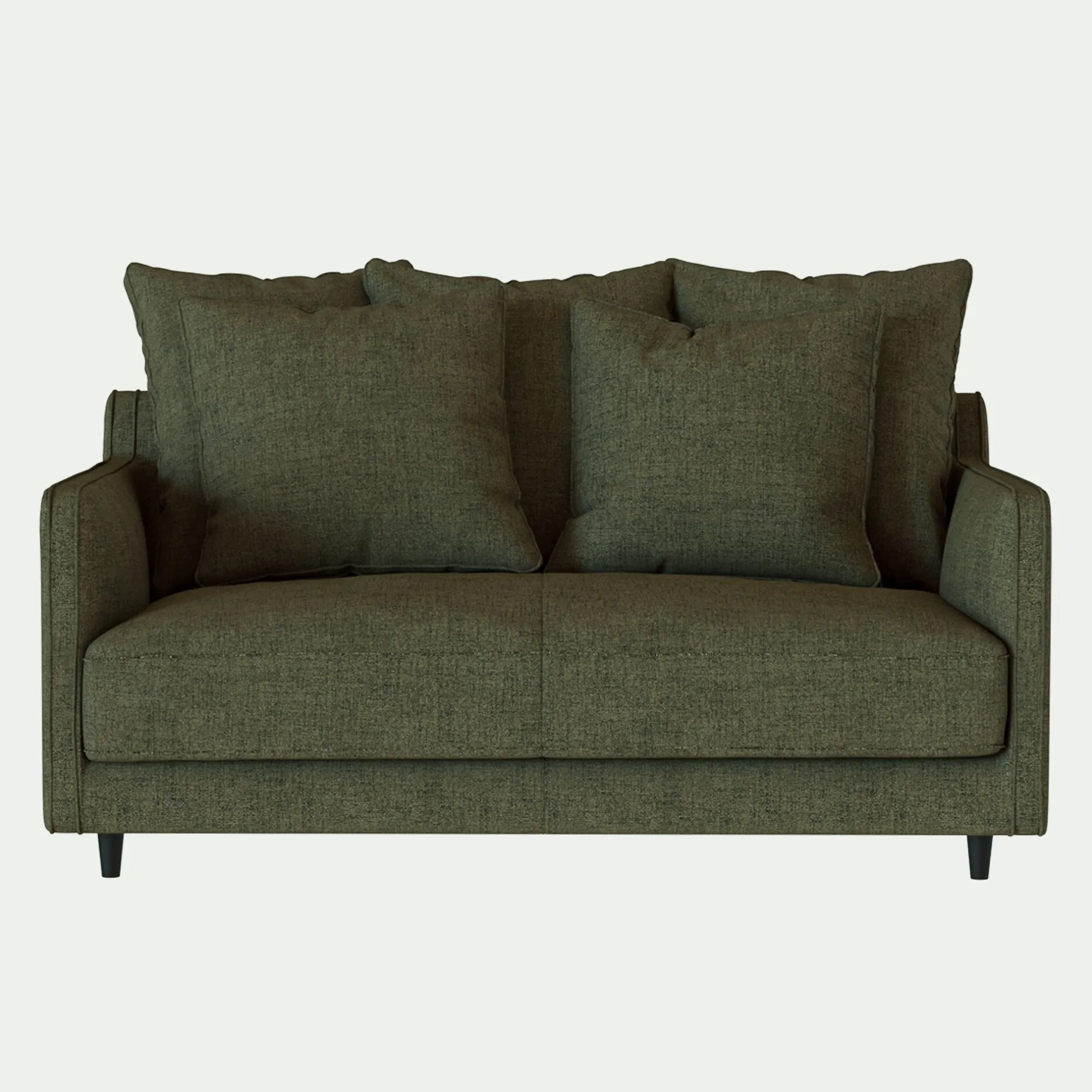 Assise et dossier : Assise en mousse polyuréthane densité 30kg/m3 et couette en fibre polyester. Coussins dossier garnissage plumes d’oies et fibres polyester, 3 coussins de 60x60cm, 2 coussins de 50x50cm.