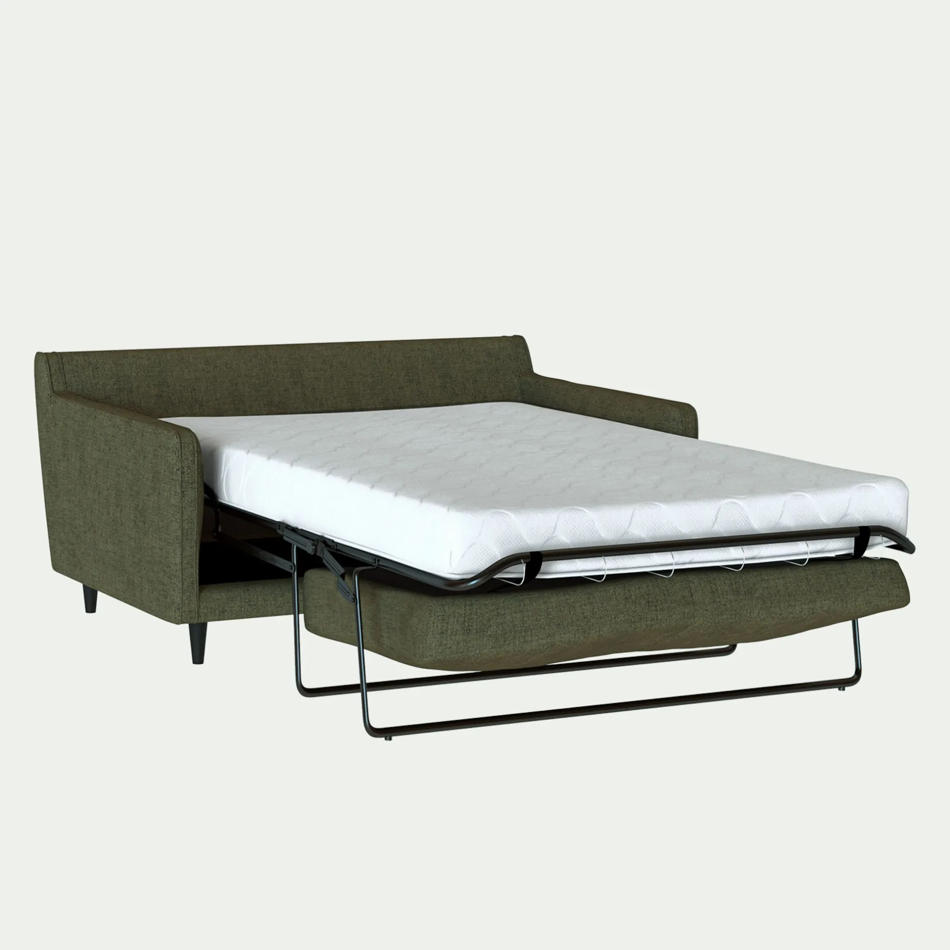 Sommier électro-soudé et sangles élastiques entrecroisées. Pieds hêtre finition vernis teinté wengé.