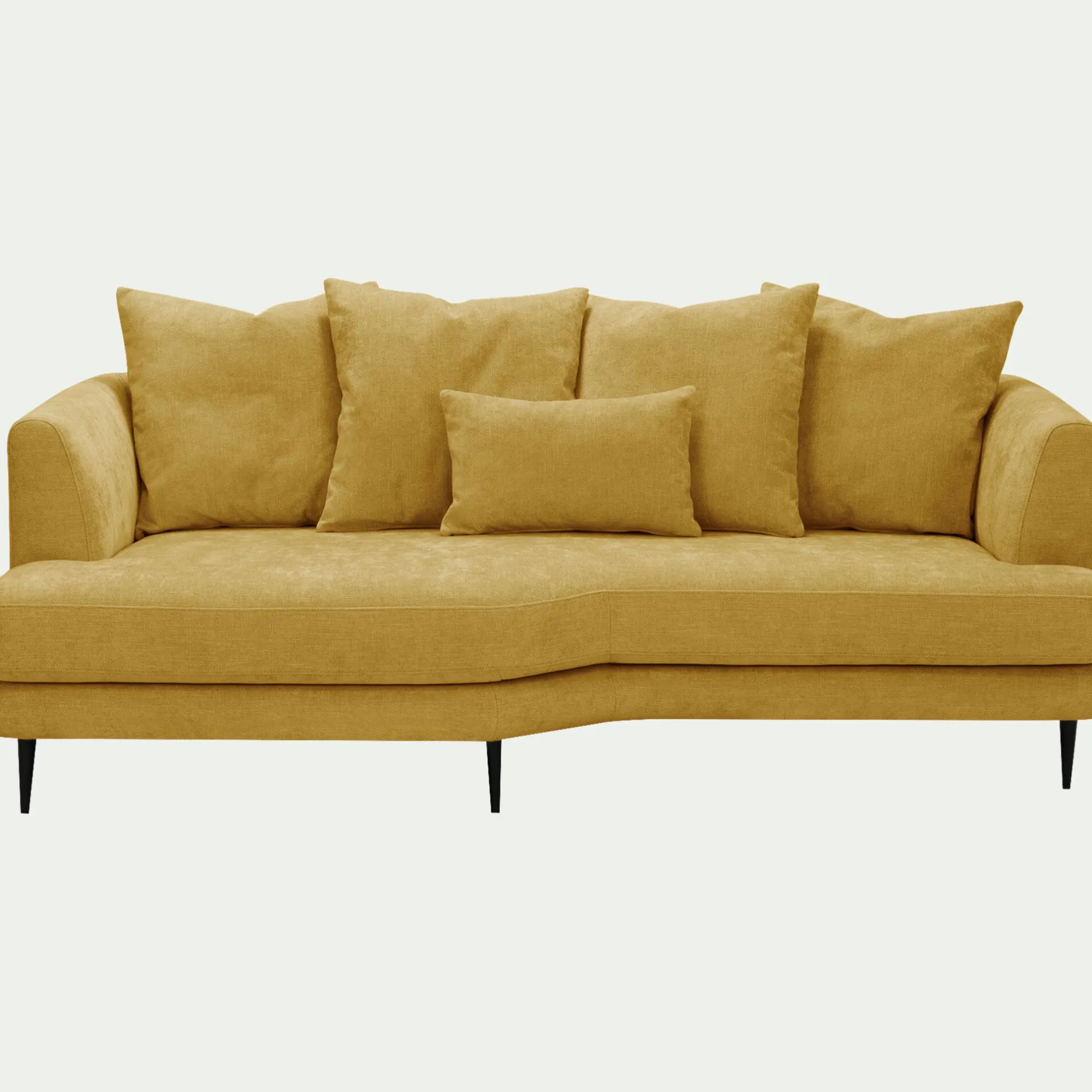 Avec sa découpe originale et asymétrique sur le côté gauche, ce canapé 3 places impose une allure unique et raffinée dans le salon. Son design singulier se marie à l’élégance discrète de son coloris jaune argan, doux et intemporel, pour sublimer la décoration intérieure. Son décroché crée une assise plus profonde, idéale pour savourer des instants de détente dans un confort absolu. À la fois atypique et sophistiqué, ce canapé fixe en tissu devient une pièce maîtresse du séjour et ne manquera pas de séduire les convives par son charme distinctif.