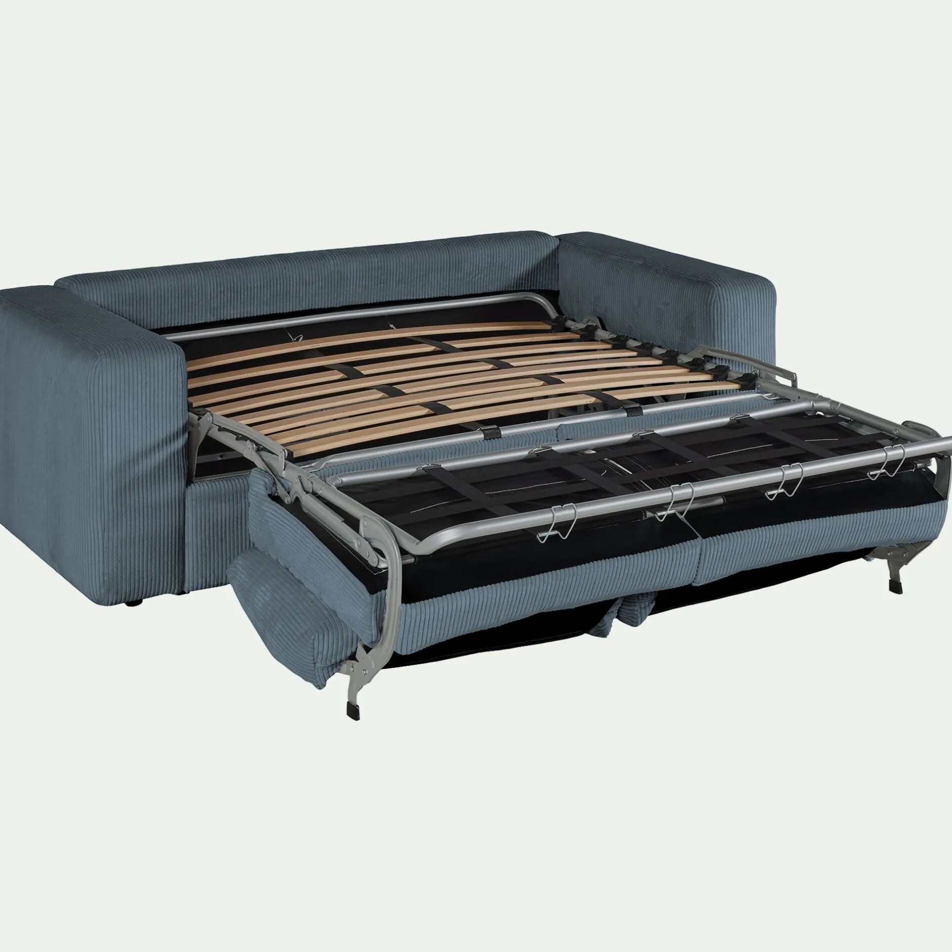 Le canapé Piuma est idéal pour se prélasser dans votre salon. Avec ses grandes assises, ce canapé 3 places convertible en velours côtelé vous offre un confort exceptionnel. Il vous permet de vous détendre au coeur de coussins moelleux qui vous font sentir dans un nuage de douceur, une sensation renforcée par son tissu délicat. Vous pourrez ainsi recevoir famille et amis à partager des soirées conviviales lors d’un moment apaisant et les inviter à dormir grâce à son couchage quotidien. Pour les plus petits appartements, il pourra vous faire gagner de la place grâce à son double usage. Ce canapé convertible de couleur bleu apporte également une touche design moderne et élégante à votre salon. Son velours côtelé donne un côté cocooning qui vous permet de transformer votre pièce en un espace chaleureux. Piuma fait ainsi rimer confort avec esthétisme et élégance.