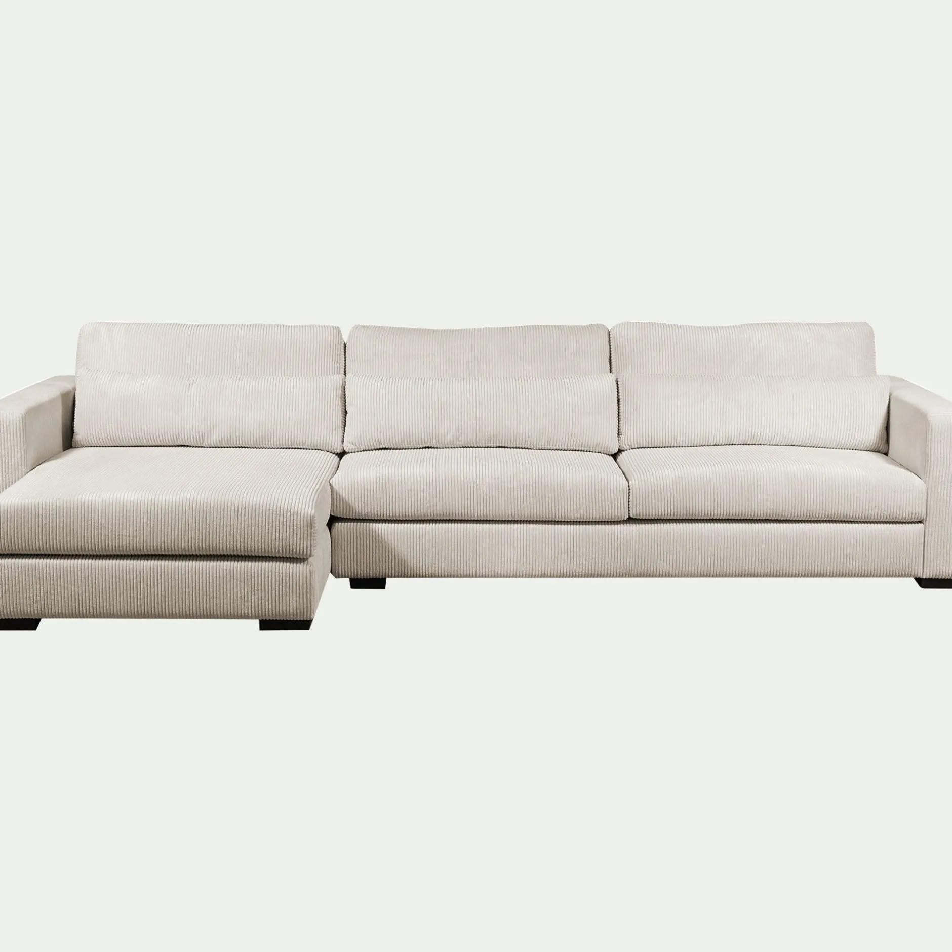 Spacieux et raffiné, le canapé d’angle Batis avec angle à gauche transforme le salon en un espace convivial et confortable. Sa chaise longue offre un espace idéal pour s’allonger et savourer un véritable instant de repos. En velours côtelé, il insuffle un vent de douceur et d’élégance dans le salon. Son coloris beige illumine la pièce et crée un espace où le bien-être règne. Conçu pour durer, ce canapé fixe repose sur une structure en bois massif, garantissant solidité et stabilité. Il s’impose comme l’élément central du séjour, invitant au partage et à la relaxation.