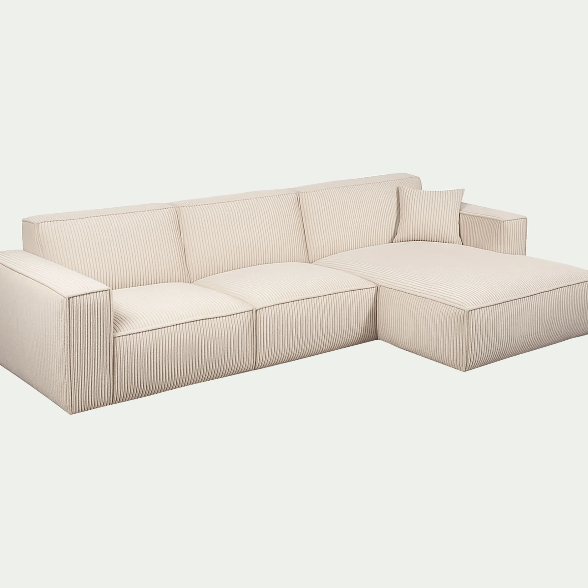 Le canapé d’angle droit Kubo transformera votre intérieur tout en vous offrant un confort absolu pour vos moments de détente grâce à sa grande méridienne. Ses lignes rectangulaires confèrent une touche de modernité à votre salon, ajoutant une note contemporaine à votre décoration. Conçu en Ukraine, ce canapé fixe allie qualité et savoir-faire. Son assise généreuse et moelleuse vous permettra d’accueillir famille et amis pour des moments de partage conviviaux. Revêtu d’un velours côtelé dans notre coloris beige, il adoucit votre pièce pour une ambiance chic et actuelle.