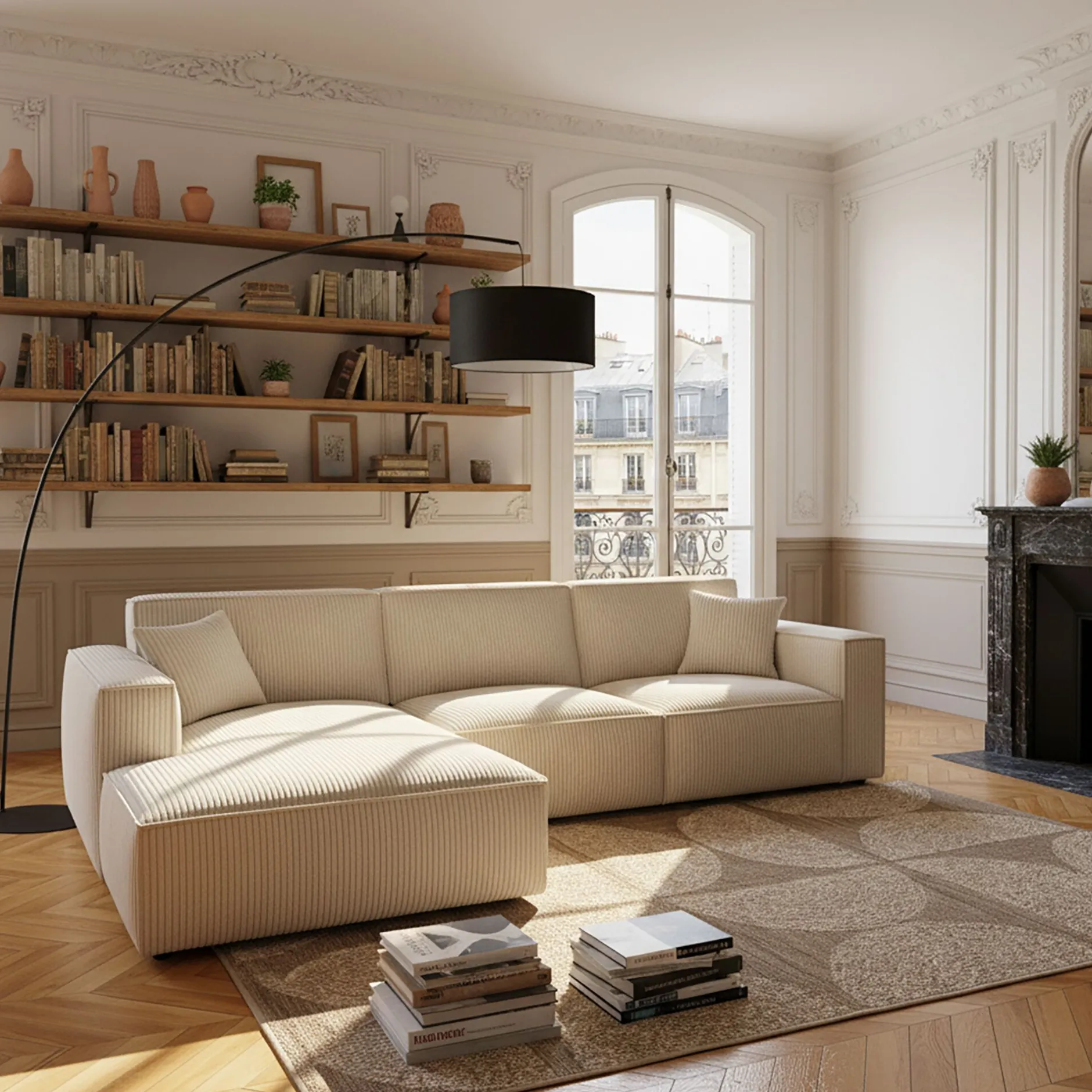 Le canapé d’angle gauche Kubo transformera votre intérieur tout en vous offrant un confort absolu pour vos moments de détente grâce à sa grande méridienne. Ses lignes rectangulaires confèrent une touche de modernité à votre salon, ajoutant une note contemporaine à votre décoration. Conçu en Ukraine, ce canapé fixe allie qualité et savoir-faire. Son assise généreuse et moelleuse vous permettra d’accueillir famille et amis pour des moments de partage conviviaux. Revêtu d’un velours côtelé dans notre coloris beige, il adoucit votre pièce pour une ambiance chic et actuelle.