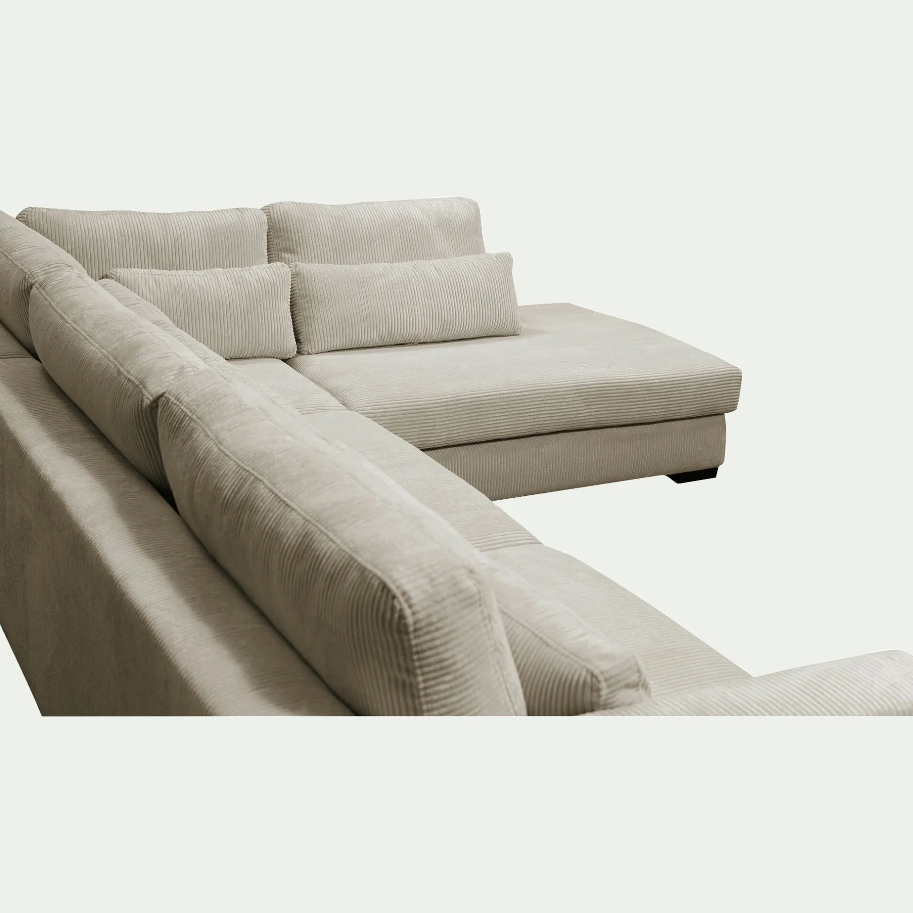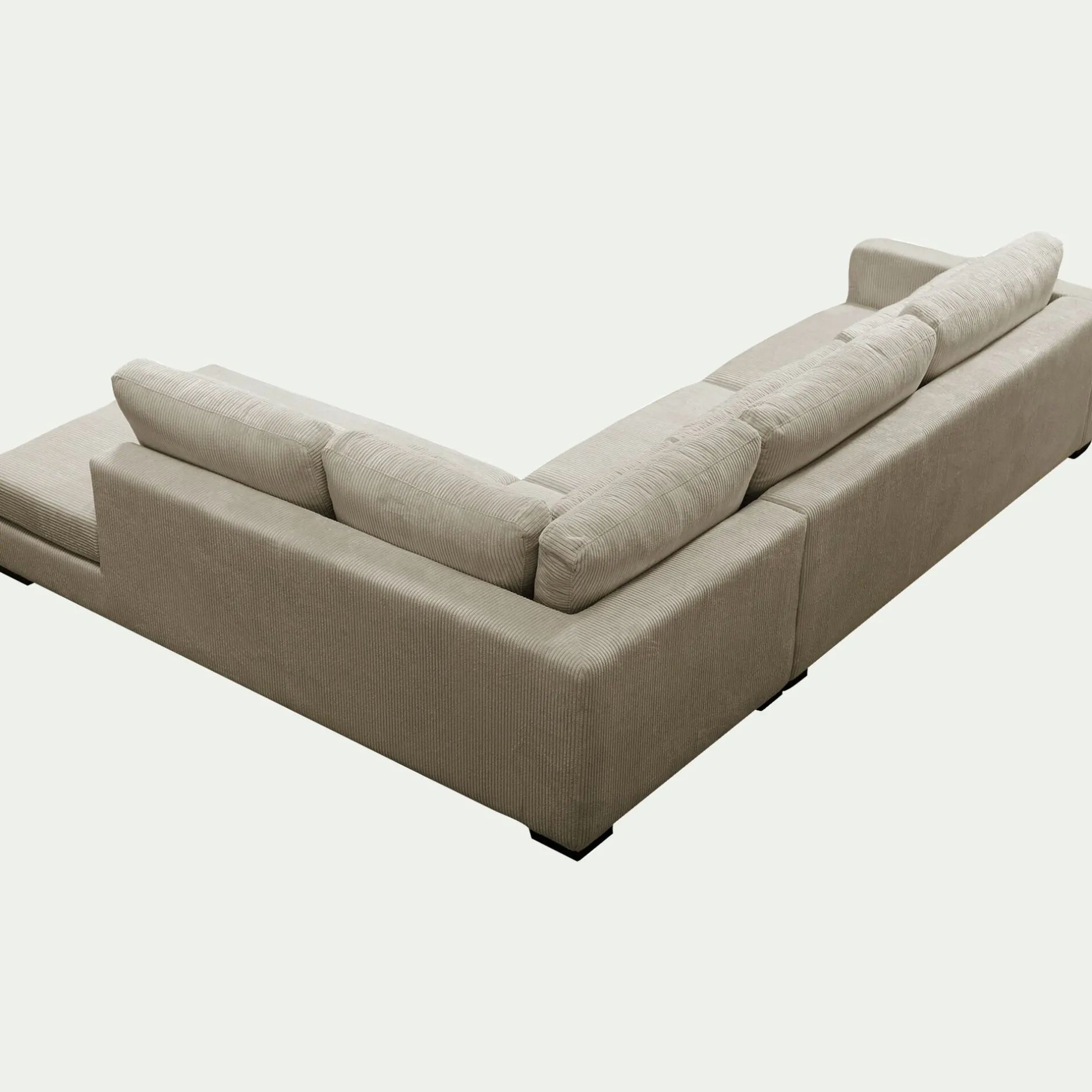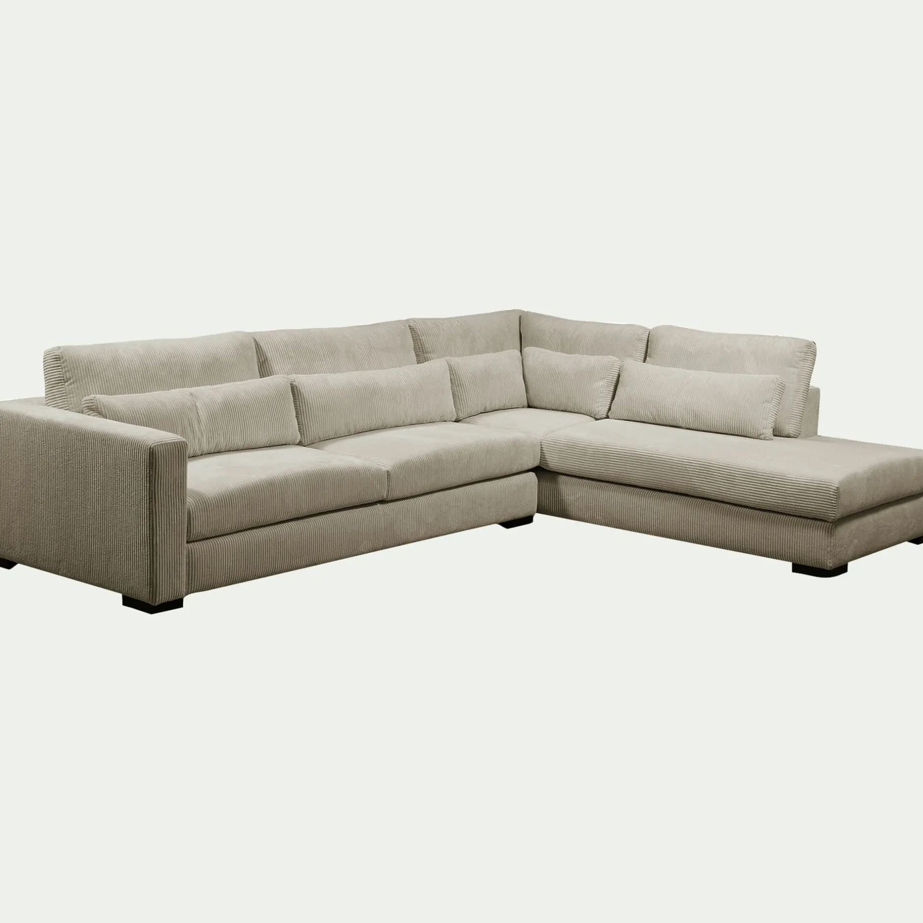 Ce canapé d’angle avec méridienne à droite transforme le salon en un véritable espace bien-être. Son grand format accueille toute la famille ou permet de s’allonger entièrement pour une détente absolue. Revêtu d’un velours côtelé dans un coloris taupe à la fois naturel et intemporel, il séduit par son toucher doux et soyeux, reflétant la lumière pour une touche de brillance. Son assise profonde repose sur une structure en bois massif et des ressorts qui garantissent un maintien souple et durable. Pratique, ses coussins de dossier et d’assise sont déhoussables pour un entretien facilité. Généreux et élégant, ce grand canapé fixe insuffle du caractère à la pièce et s’impose comme un allié incontournable des instants de détente et de convivialité.