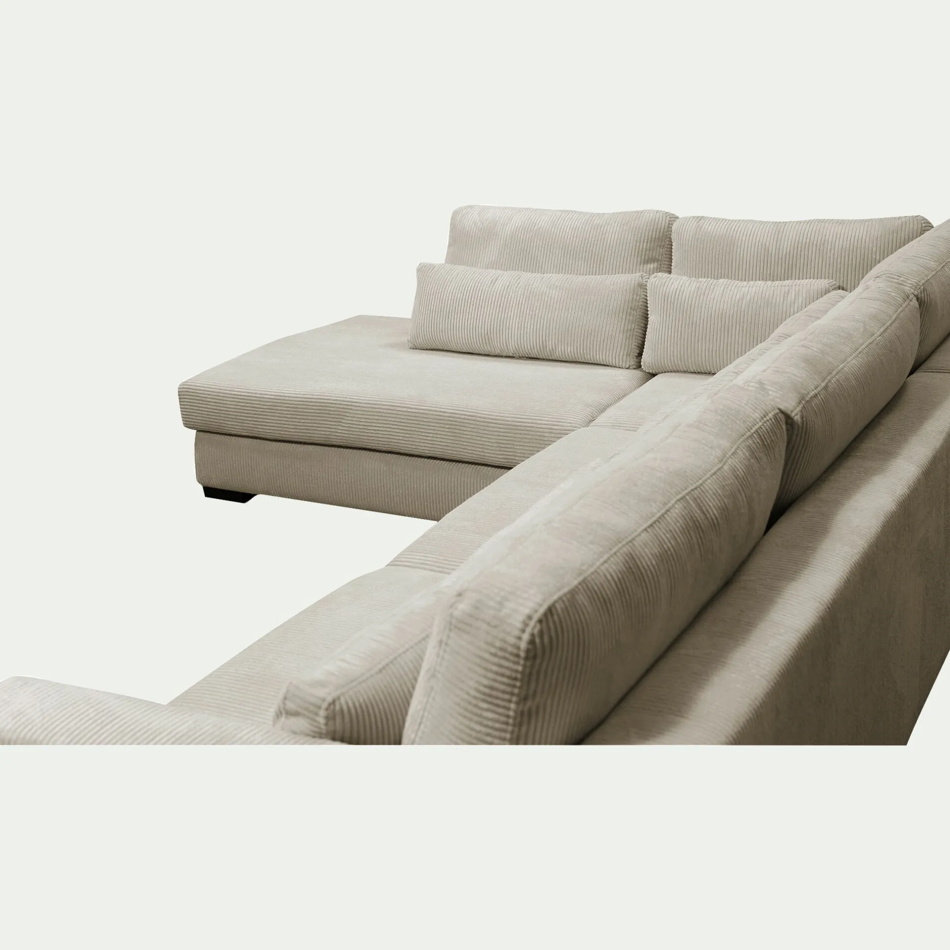 Ce canapé d’angle avec méridienne à gauche transforme le salon en un véritable espace bien-être. Son grand format accueille toute la famille ou permet de s’allonger entièrement pour une détente absolue. Revêtu d’un velours côtelé dans un coloris taupe à la fois naturel et intemporel, il séduit par son toucher doux et soyeux, reflétant la lumière pour une touche de brillance. Son assise profonde repose sur une structure en bois massif et des ressorts qui garantissent un maintien souple et durable. Pratique, ses coussins de dossier et d’assise sont déhoussables pour un entretien facilité. Généreux et élégant, ce grand canapé fixe insuffle du caractère à la pièce et s’impose comme un allié incontournable des instants de détente et de convivialité.