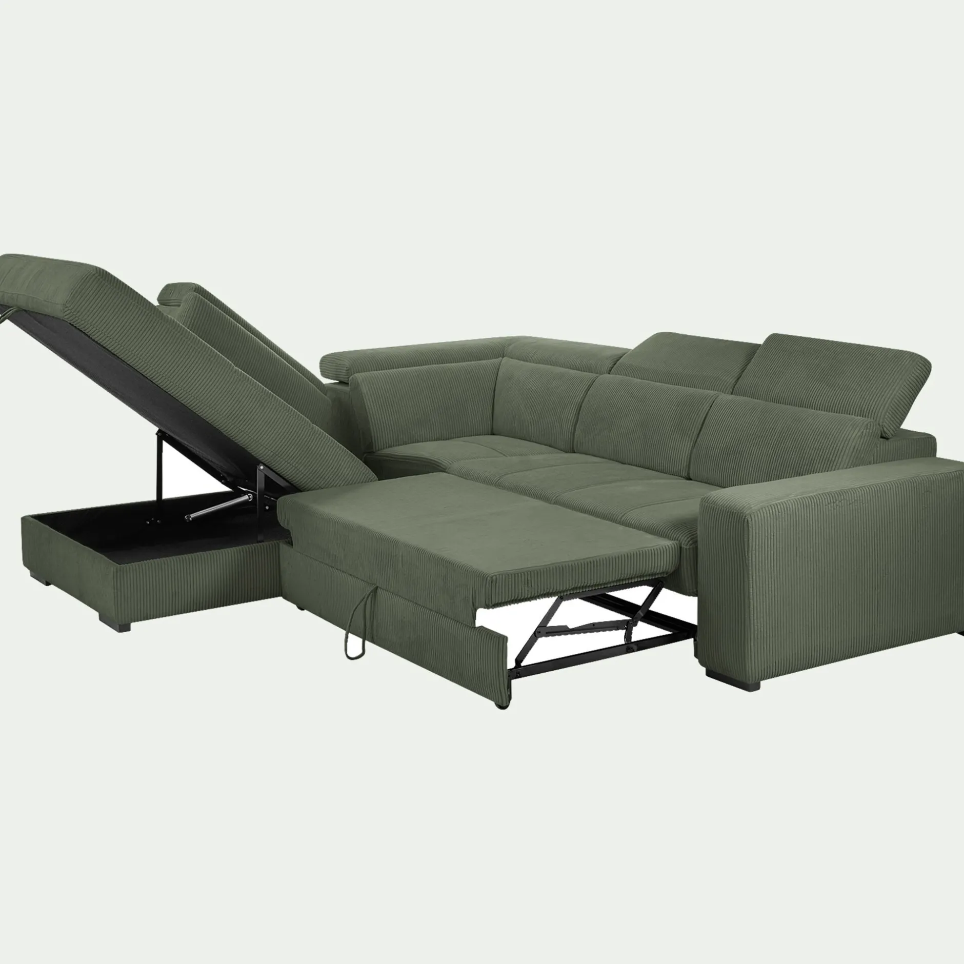 Le canapé Origano séduit par son grand angle à gauche et son design contemporain, alliant confort et fonctionnalité. Convertible en couchage occasionnel de 130×200 cm, il offre un espace pratique pour accueillir vos invités. Son tissu côtelé vert cèdre diffuse une douceur lumineuse et intemporelle dans le salon, tandis que la méridienne intègre un coffre de rangement astucieux. Ce canapé fabriqué en Roumanie combine style, confort et praticité au quotidien.