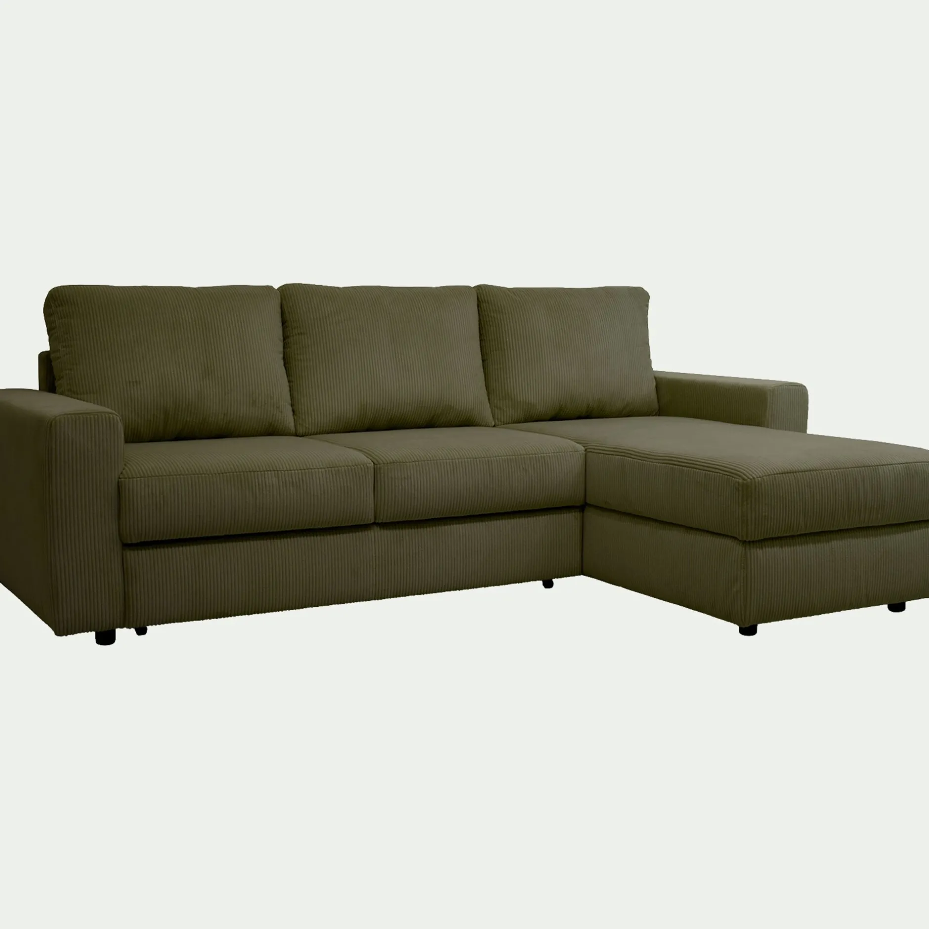 Le canapé Honoré cumule confort, praticité et élégance pour devenir la pièce maîtresse du salon. Son généreux format 4 places en velours côtelé vert cèdre invite à la détente, avec un dossier moelleux et une assise accueillante. Sa méridienne réversible, positionnable à droite comme à gauche, permet d’adapter facilement l’agencement selon l’espace disponible. Elle dissimule par ailleurs un coffre de rangement astucieux, idéal pour optimiser l’organisation du salon. Convertible, ce canapé se transforme en un couchage d’appoint de 140×200 cm, parfait pour recevoir en toute sérénité. Chaleureux et fonctionnel, il combine allure contemporaine et confort absolu, pour des instants de partage comme de repos.