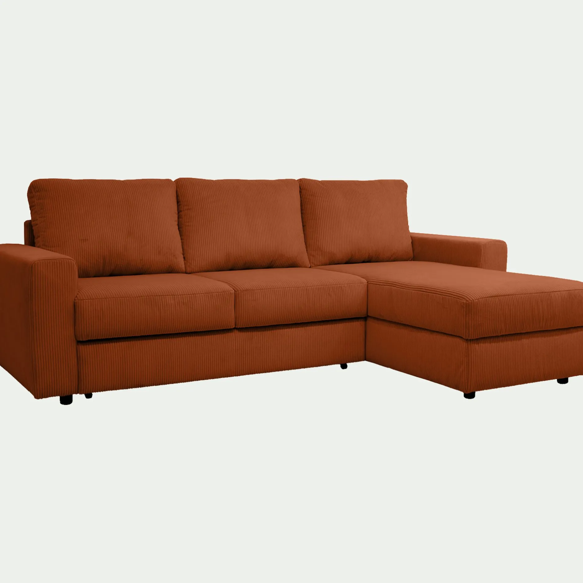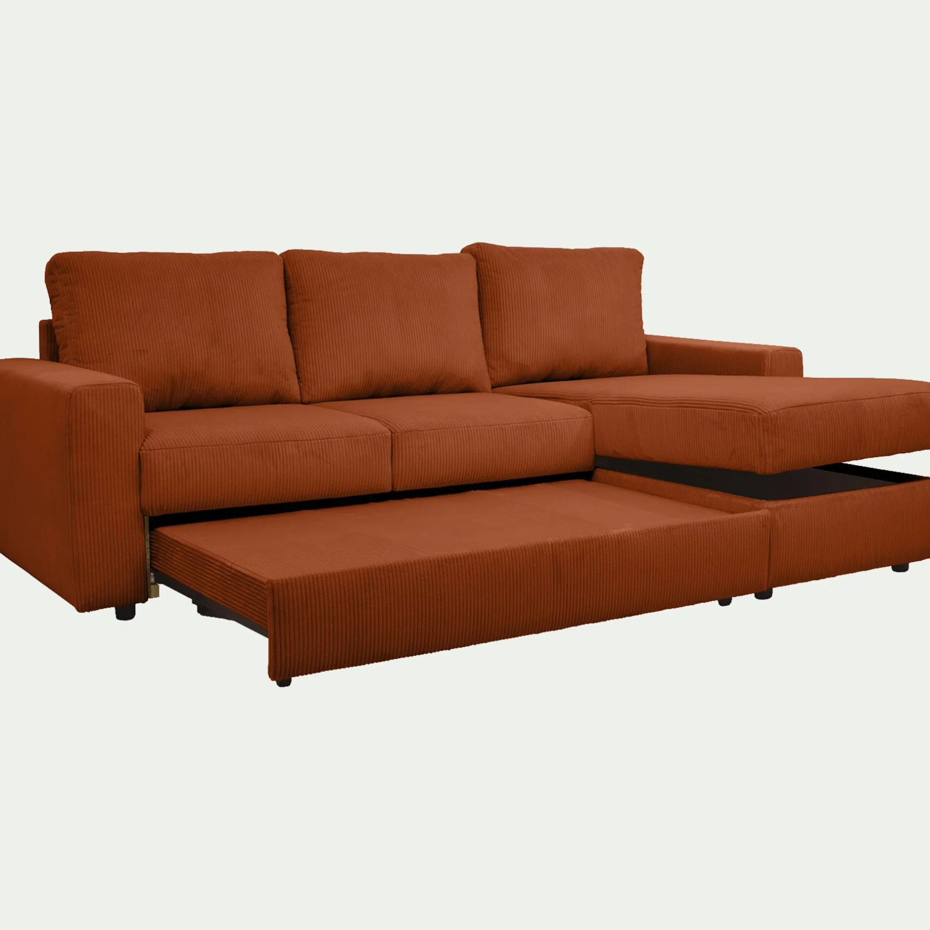 Un élégant canapé d’angle en velours côtelé 4 places pour votre salon. Son coloris brun rustrel apporte une touche de nature méditerranéenne tendance à votre décoration. Un canapé confortable doté d’épais coussins pour une assise d’une grande qualité. Ce canapé s’ouvre facilement et vous permet d’obtenir un lit pour vos convives. Un couchage occasionnel de grande taille, particulièrement utile. Sa méridienne peut être fixée aussi bien à droite qu’à gauche, afin que vous puissiez choisir l’angle. Elle vous offre également un grand coffre de rangement, idéal pour disposer un plaid, des couvertures et des oreillers. Entièrement conçu en France, ce canapé incarne le savoir faire et le charme à la française. Un canapé déco pour se détendre et passer d’agréables moments entre amis ou en famille.