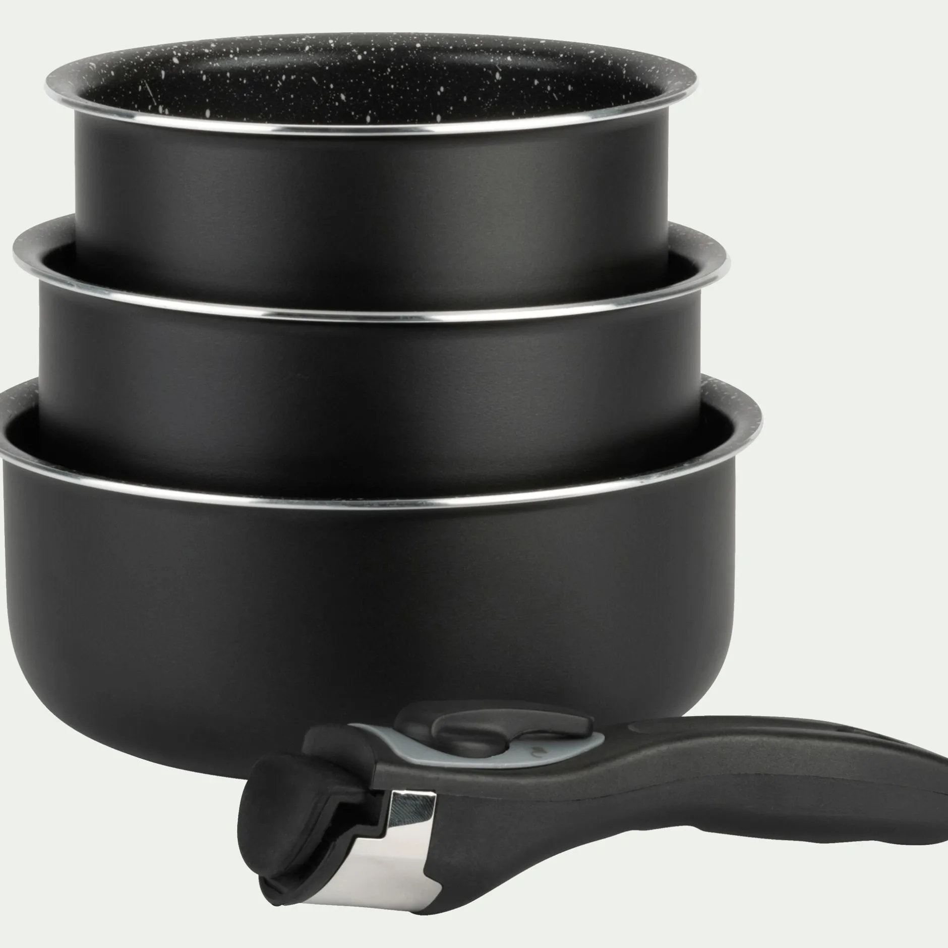 Ce lot de 3 casseroles noires de diamètre 16, 18 et 20 cm avec un manche amovible pour un rangement facilité. Avec leur revêtement anti-adhésif, vous pourrez cuisiner en toute tranquilité. Très pratique, elles s’adaptent à tous feux y compris induction.