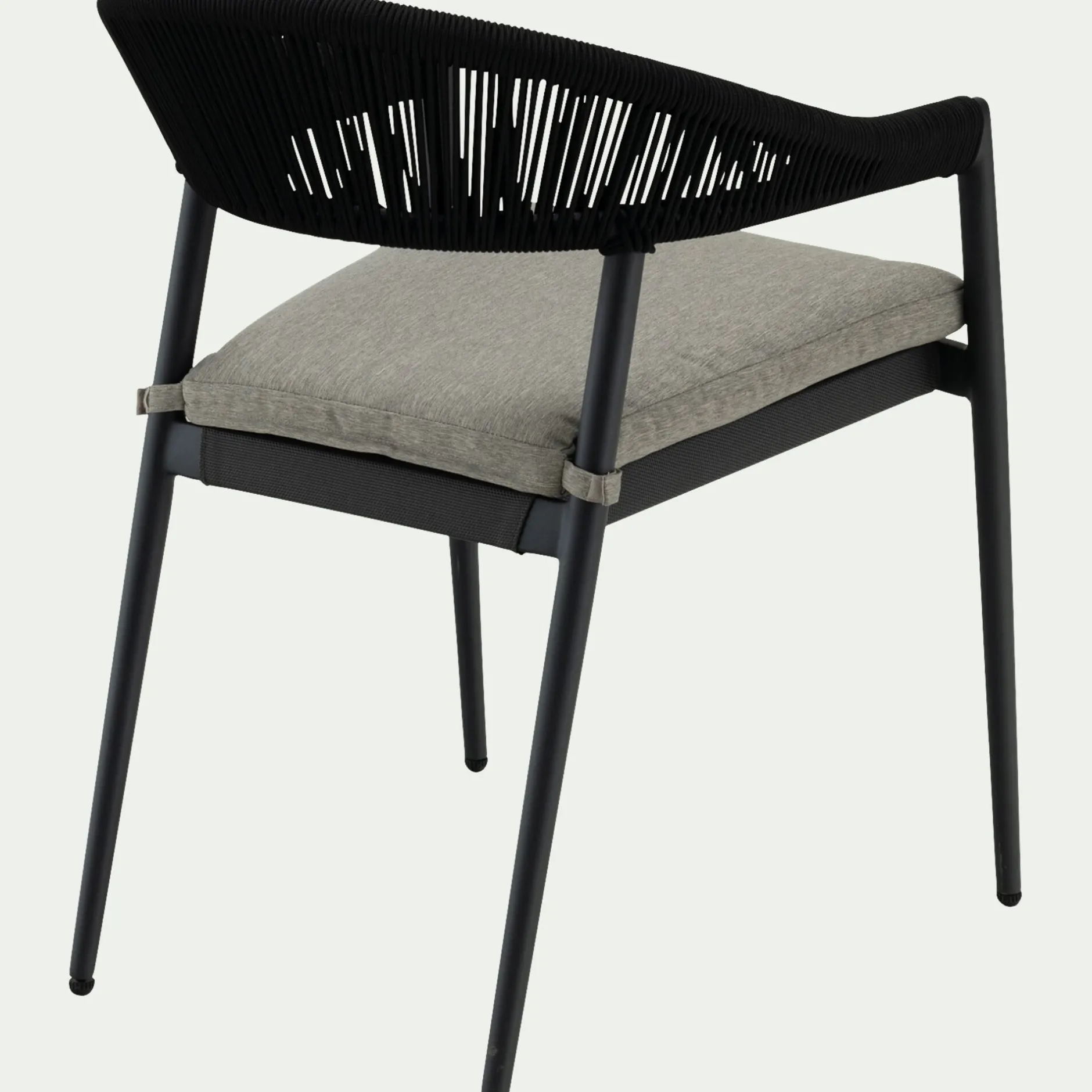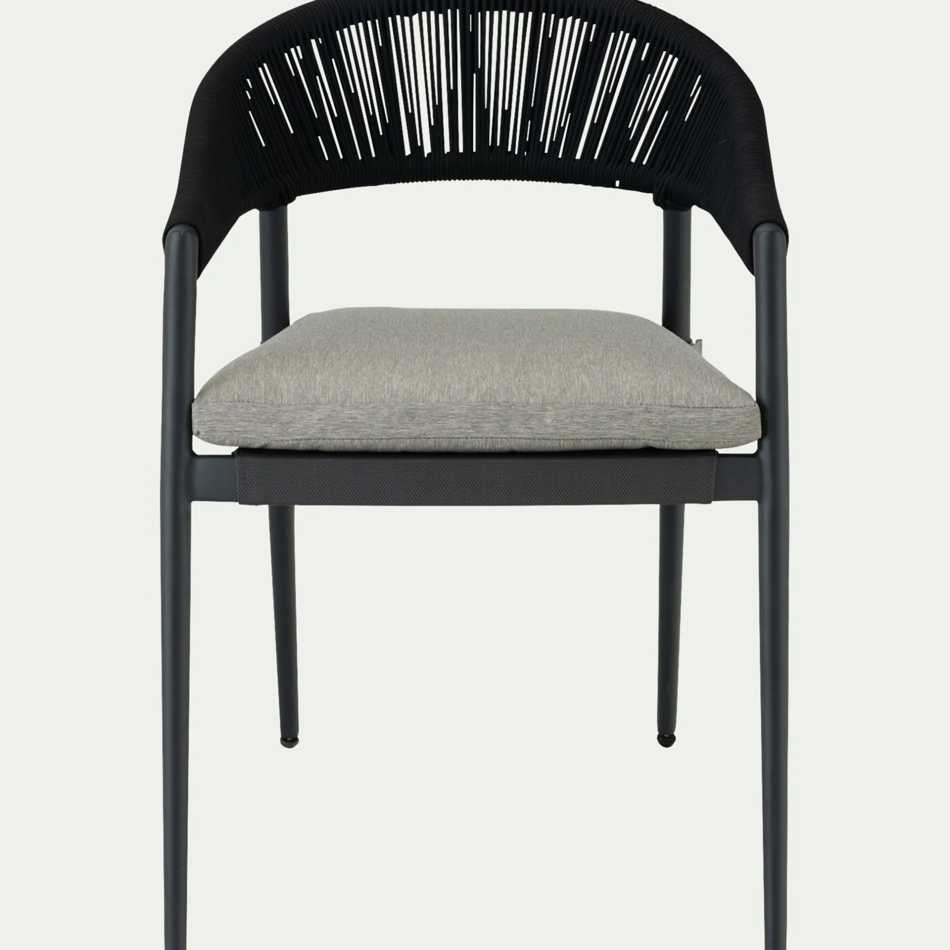 Avec son design élégant et sa silhouette enveloppante, la chaise de jardin Mormoiron allie confort et élégance. Sa structure en aluminium noir assure légèreté et durabilité, tandis que son dossier en cordage apporte une touche rustique et confortable. Un coussin gris complète l’assise pour encore plus de confort. Dotée d’un piètement en fuseau, d’accoudoirs et d’un dossier arrondi, cette chaise promet de longs repas en extérieur dans une ambiance chic et détendue.