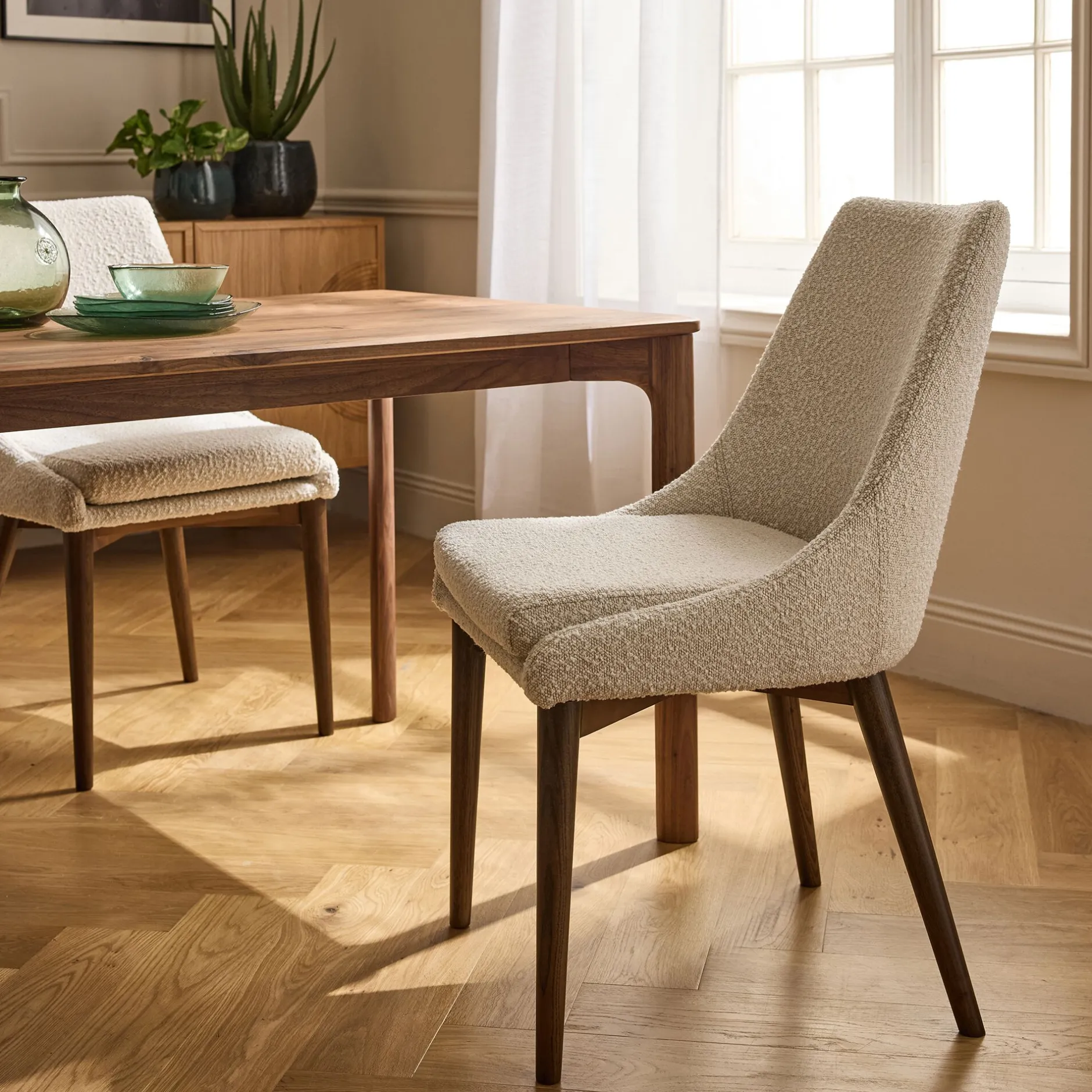 Avec son revêtement en tissu blanc écru, cette chaise de repas apporte une touche claire et naturelle à la pièce. Sa teinte neutre permet de l’associer facilement à différents styles de décoration. Le piètement en bois foncé crée un joli contraste et renforce le caractère de l’ensemble. Son dossier enveloppant et son assise généreuse assurent un bon confort au quotidien. Un modèle simple, élégant et facile à intégrer autour de la table.