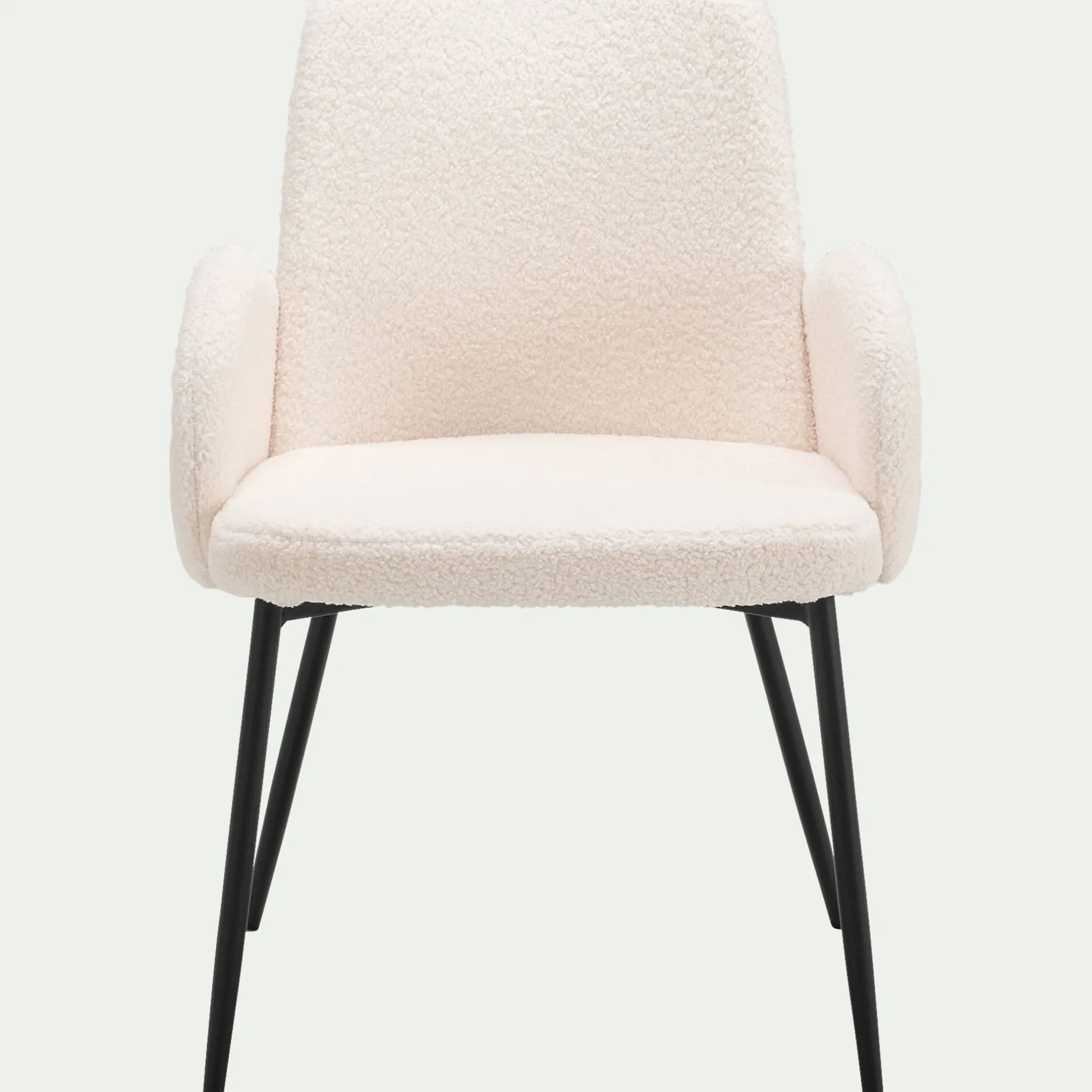La salle à manger est un des lieux privilégié de votre intérieur. Ainsi, l’aménagement de cet espace est essentiel. Pour un rendu réussi, optez pour une belle table de repas accompagnée de jolies chaises. Ainsi, optez pour cette chaise de repas en tissu bouclette blanc, souligné par un piètement en métal noir. Cette chaise avec accoudoirs attire le regard et sublime votre déco. Tout dans ses courbes et dans ses textures est pensé pour créer un meuble singulier qui marquera les esprits.