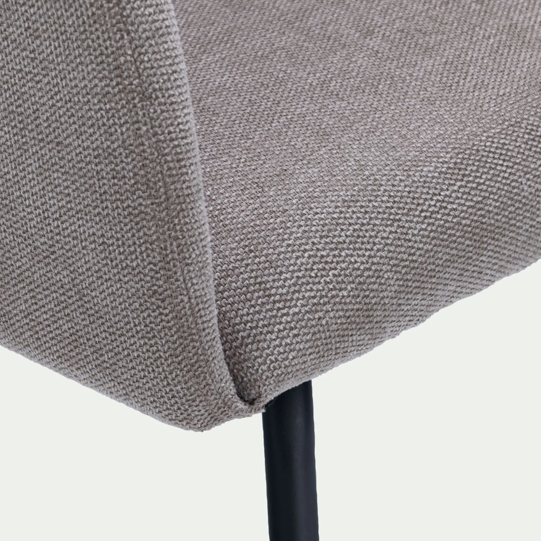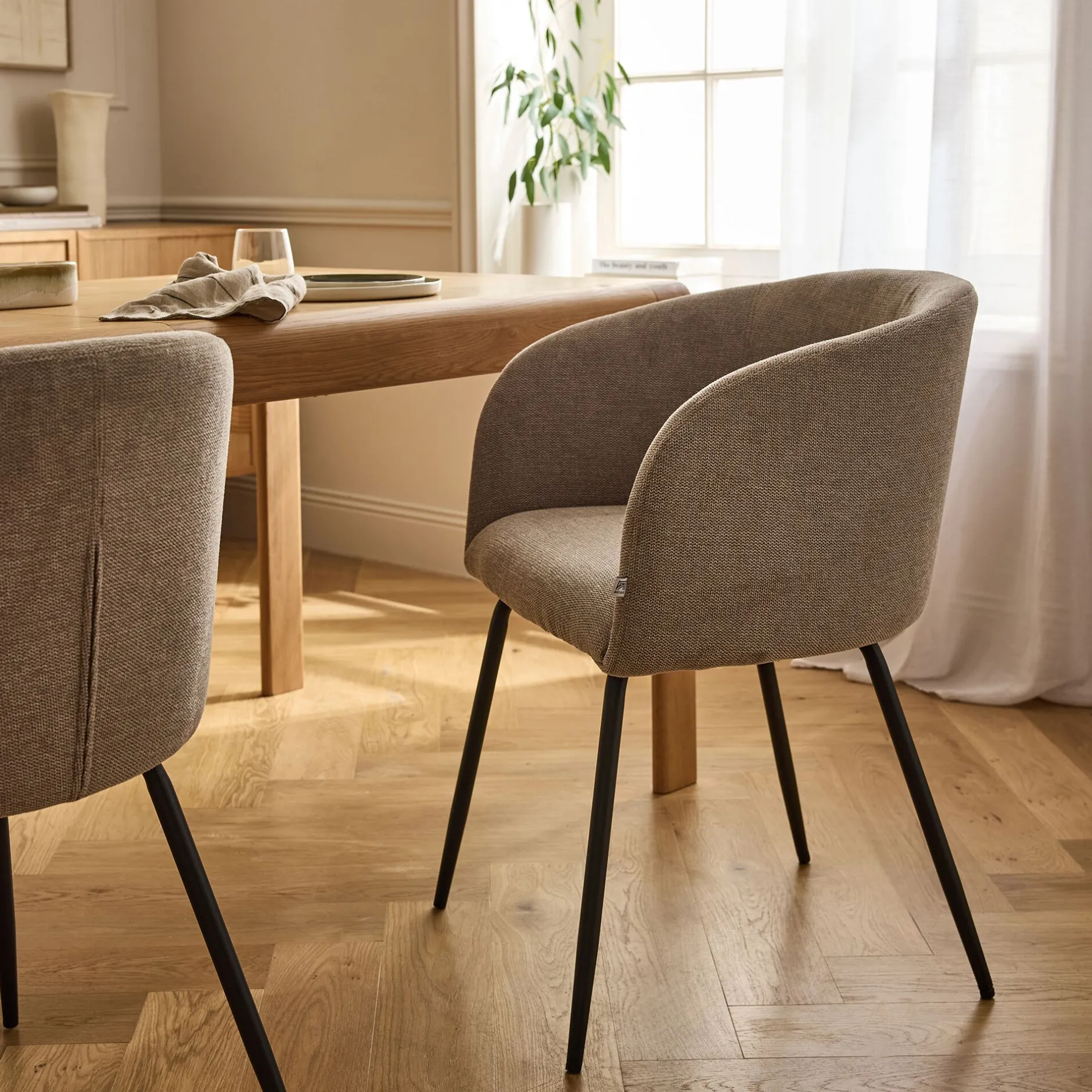 La chaise de repas Peille brouille les frontières entre chaise et fauteuil. Habillée d’un tissu beige alpilles, elle affiche un ton naturel et apaisant, rehaussé par un piètement en métal noir au design épuré. Son assise généreuse et son dossier enveloppant, prolongé par deux accoudoirs, invitent à la détente. Une chaise en tissu confortable, pensée pour savourer les repas et les conversations qui s’en suivent.