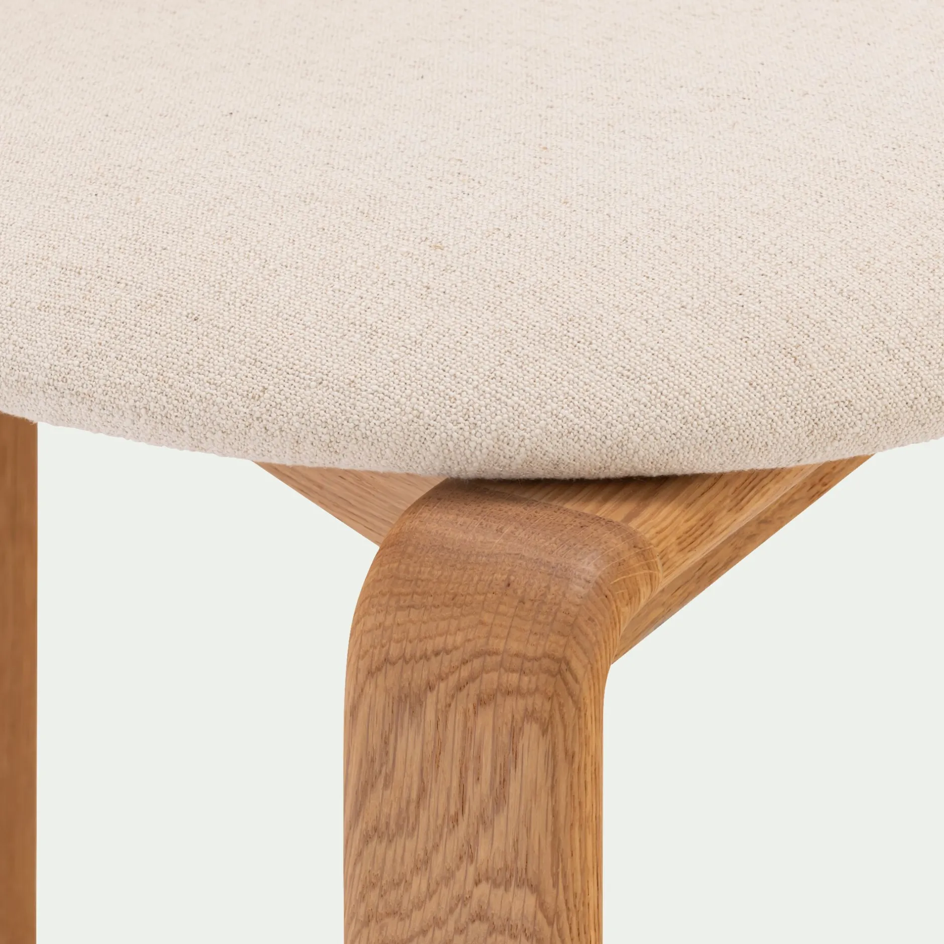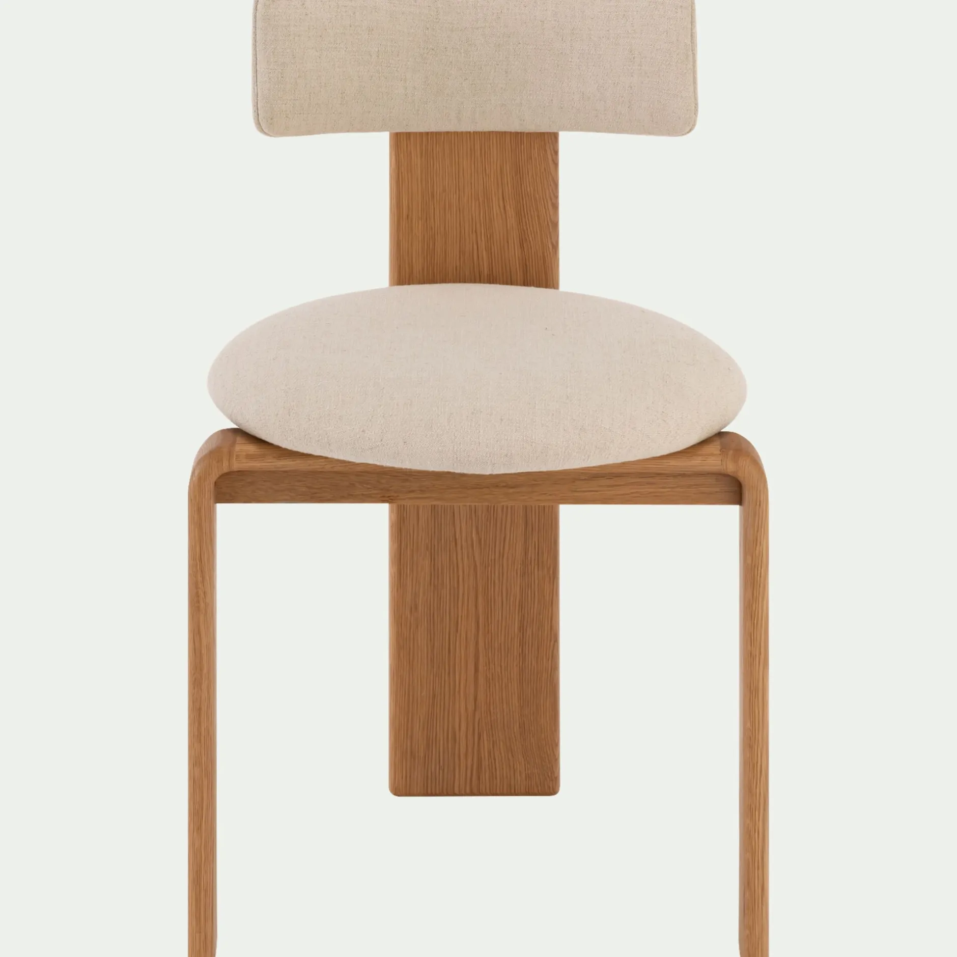 Élégante et épurée, la chaise de repas Ludovica se distingue par sa structure en chêne massif certifié FSC, garantissant une base solide et durable. Son assise et son dossier en mousse sont revêtus d’un tissu lisse beige, offrant un toucher doux et un style raffiné. Sans accoudoirs, cette chaise en tissu se glisse facilement sous la table et s’adapte aux espaces épurés. Sa silhouette originale avec ses trois pieds en fait un choix unique et moderne pour sublimer la salle à manger.