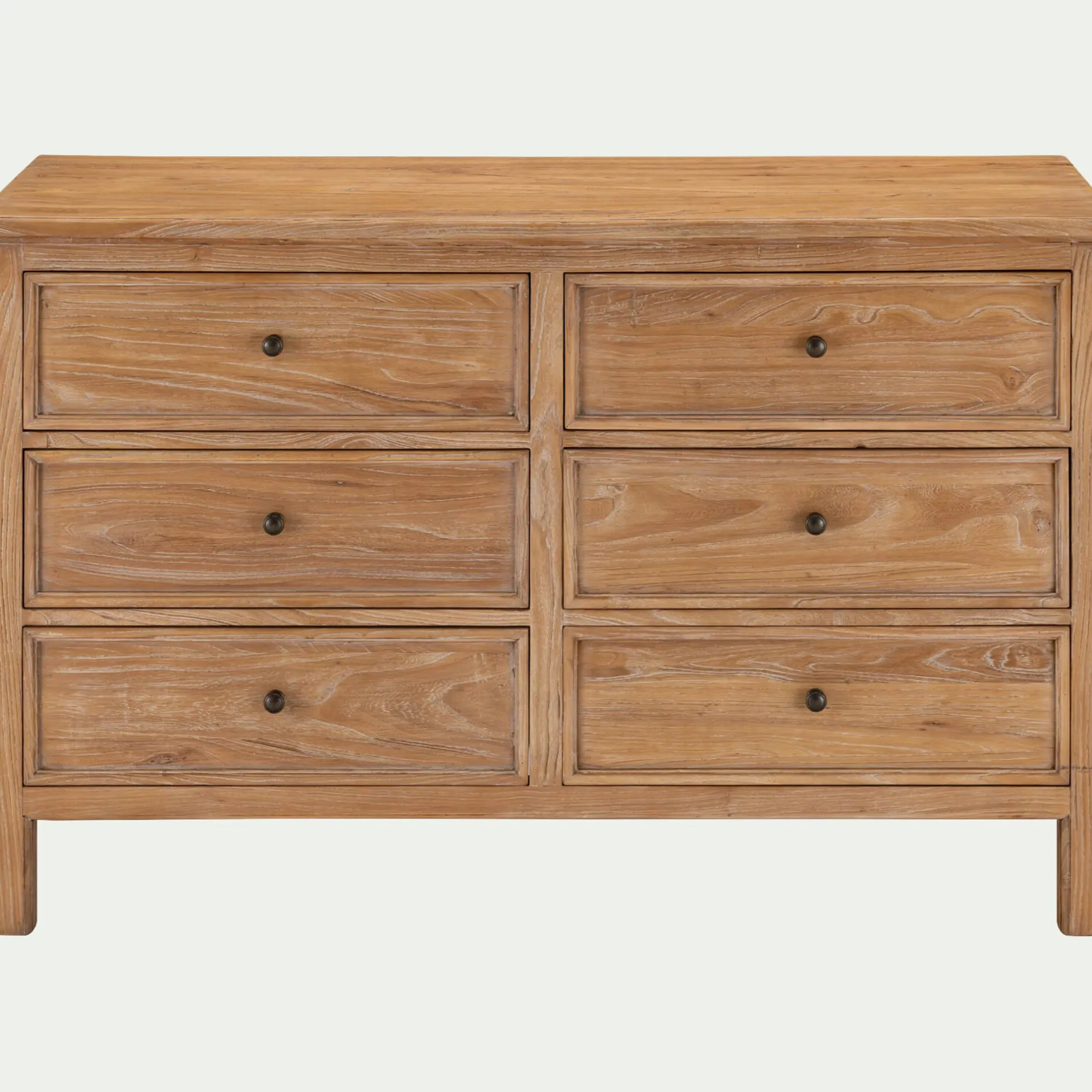 Avec ses dimensions généreuses – 140 cm de long pour 88 cm de haut – la commode Alysse offre un grand espace de rangement réparti sur 6 tiroirs. Fabriquée en bois d’orme et de pin, elle conserve un charme rustique avec ses moulures délicates et son allure chaleureuse. Parfaite pour une chambre spacieuse, elle associe esthétique classique et fonctionnalité au quotidien.