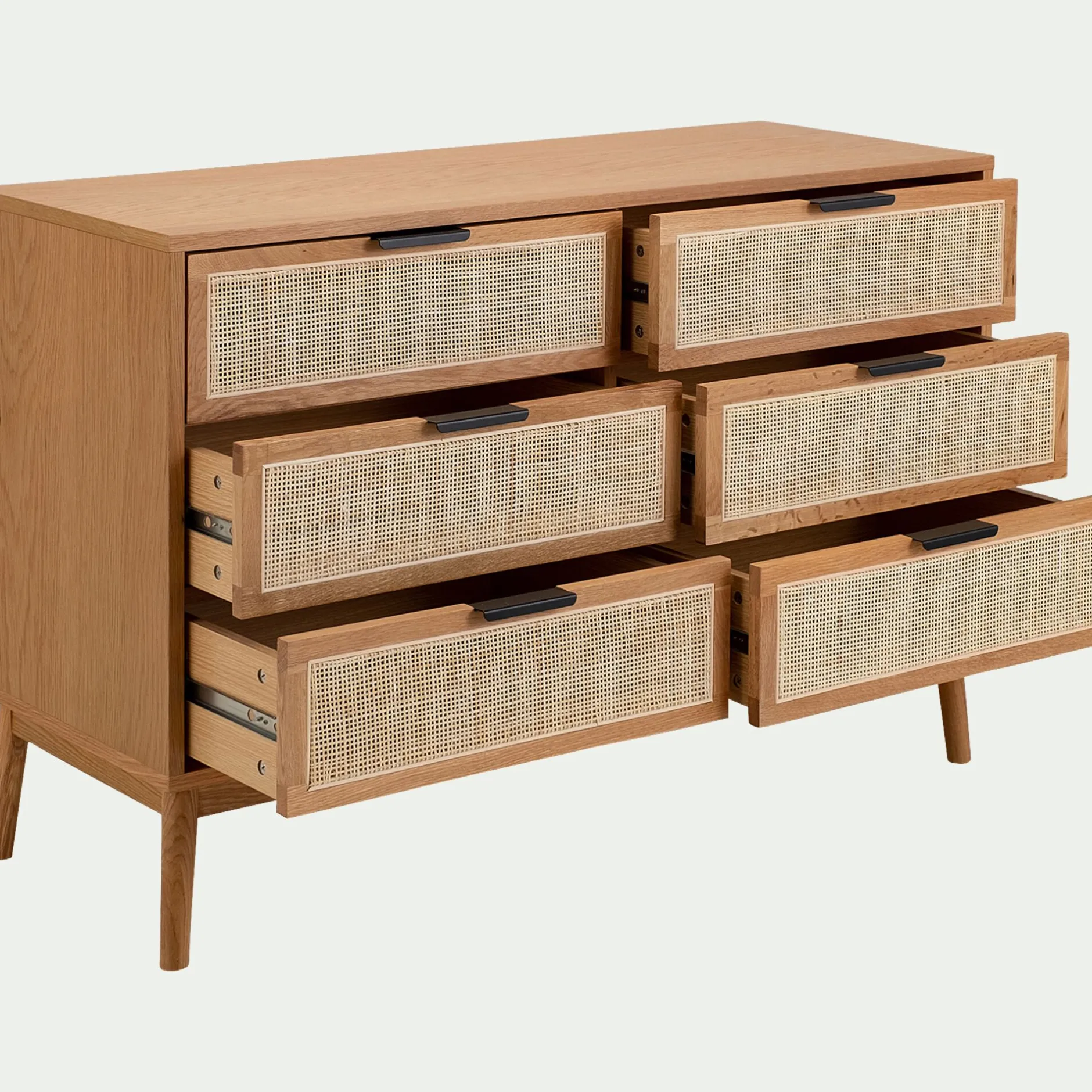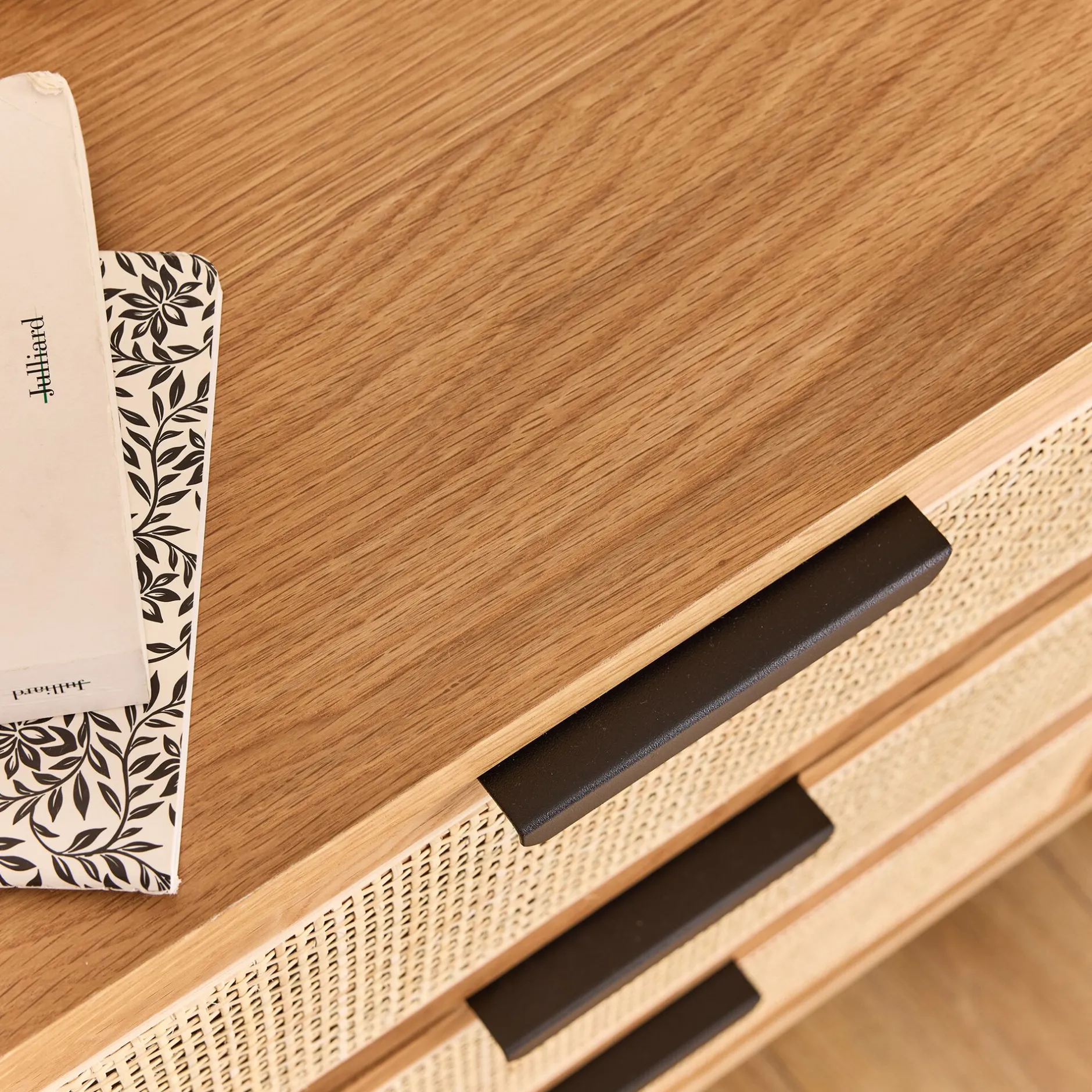 Chêne et MDF chêne plaqué, façade des tiroirs en canne naturelle.