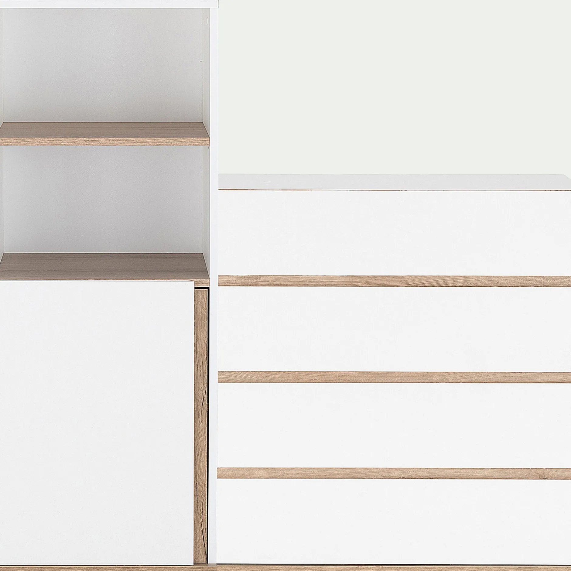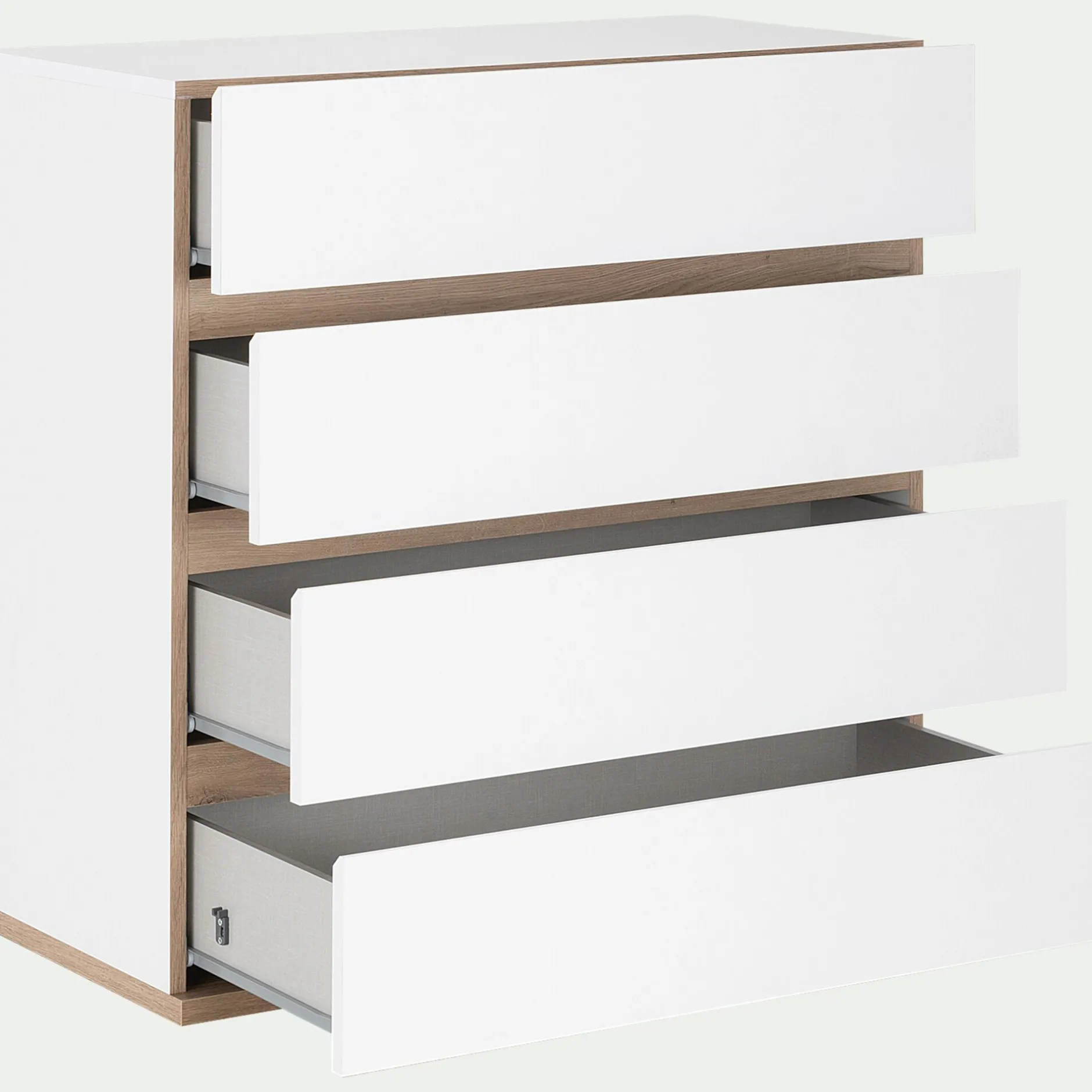 Découvrez donc le module avec quatre tiroirs, de couleur blanche où vous pouvez ranger vos vêtements et autres affaires. Vous pouvez acheter cette pièce seule ou associée à un des éléments de la gamme. Chaque module est indépendant, mais ils se complètent aussi parfaitement entre eux. Ce sont des produits de qualité qui vous sont proposés, avec une finition en mélanine et une impression effet bois au toucher. Résistants, ces meubles dureront dans le temps. Le montage de ces derniers est très aisé et se fait en vertical. Les coins des modules sont découpés afin de laisser passer les plinthes et que vous puissiez placer vos meubles contre le mur.
