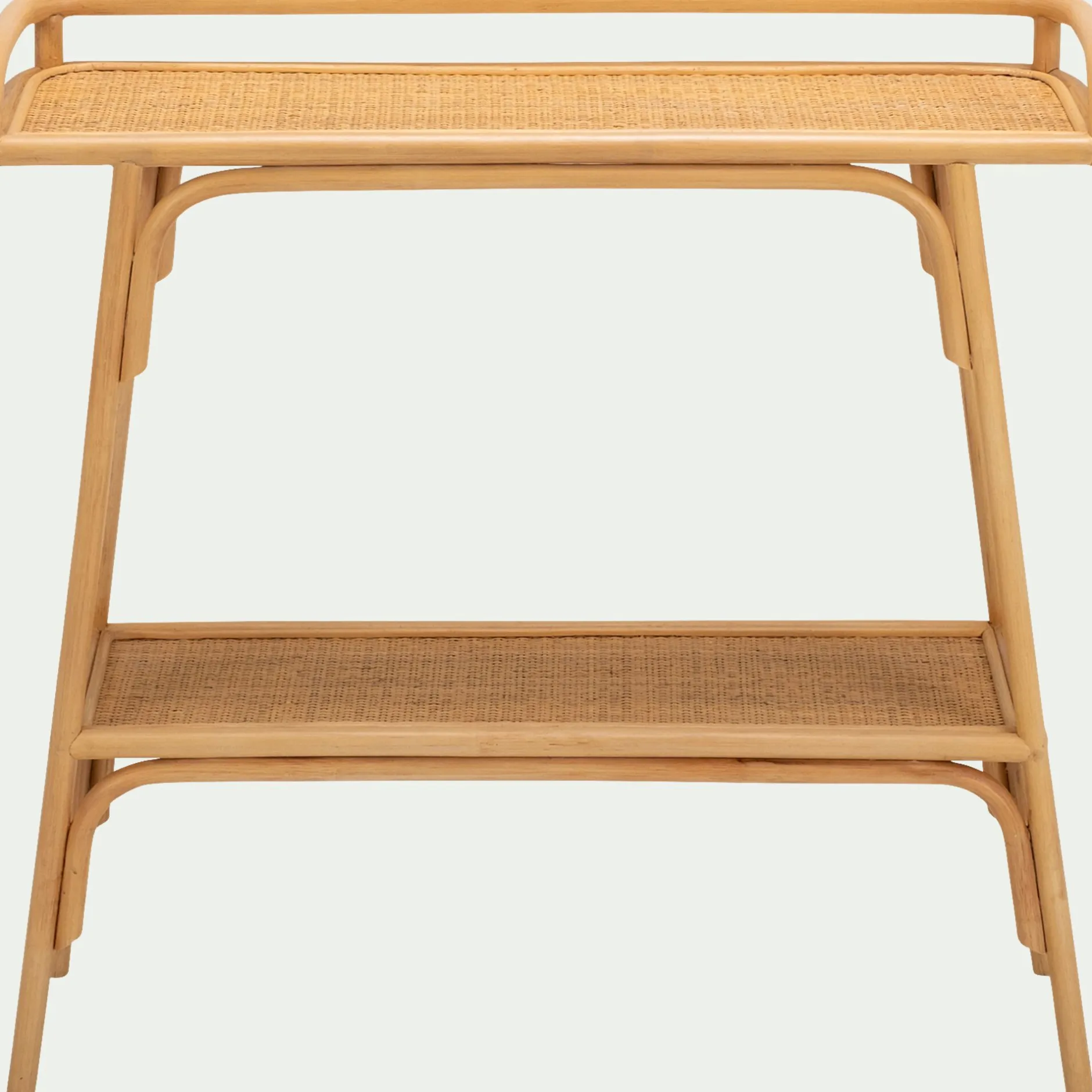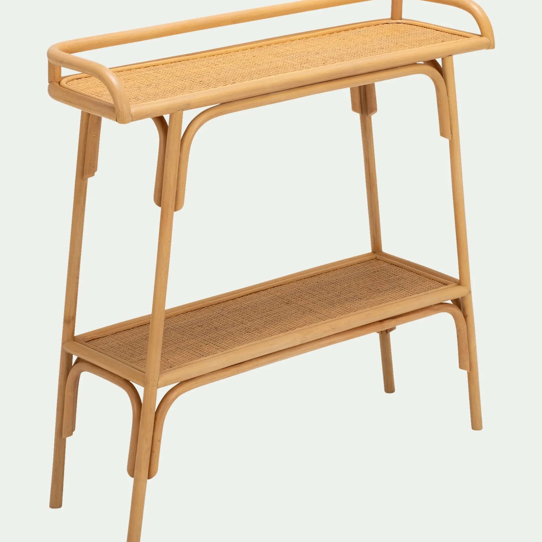 Cette console, idéale pour l’entrée ou le couloir, combine à merveille fonctionnalité et esthétique. Avec ses deux niveaux, elle permet de ranger et exposer facilement objets déco, vide-poche et plantes. La partie basse, pratique pour déposer une paire de chaussures, se marie parfaitement avec le plateau supérieur pour une touche d’élégance. Confectionnée en bois et rotin, elle apporte une note naturelle et douce, tout en ajoutant de la légèreté à votre intérieur.