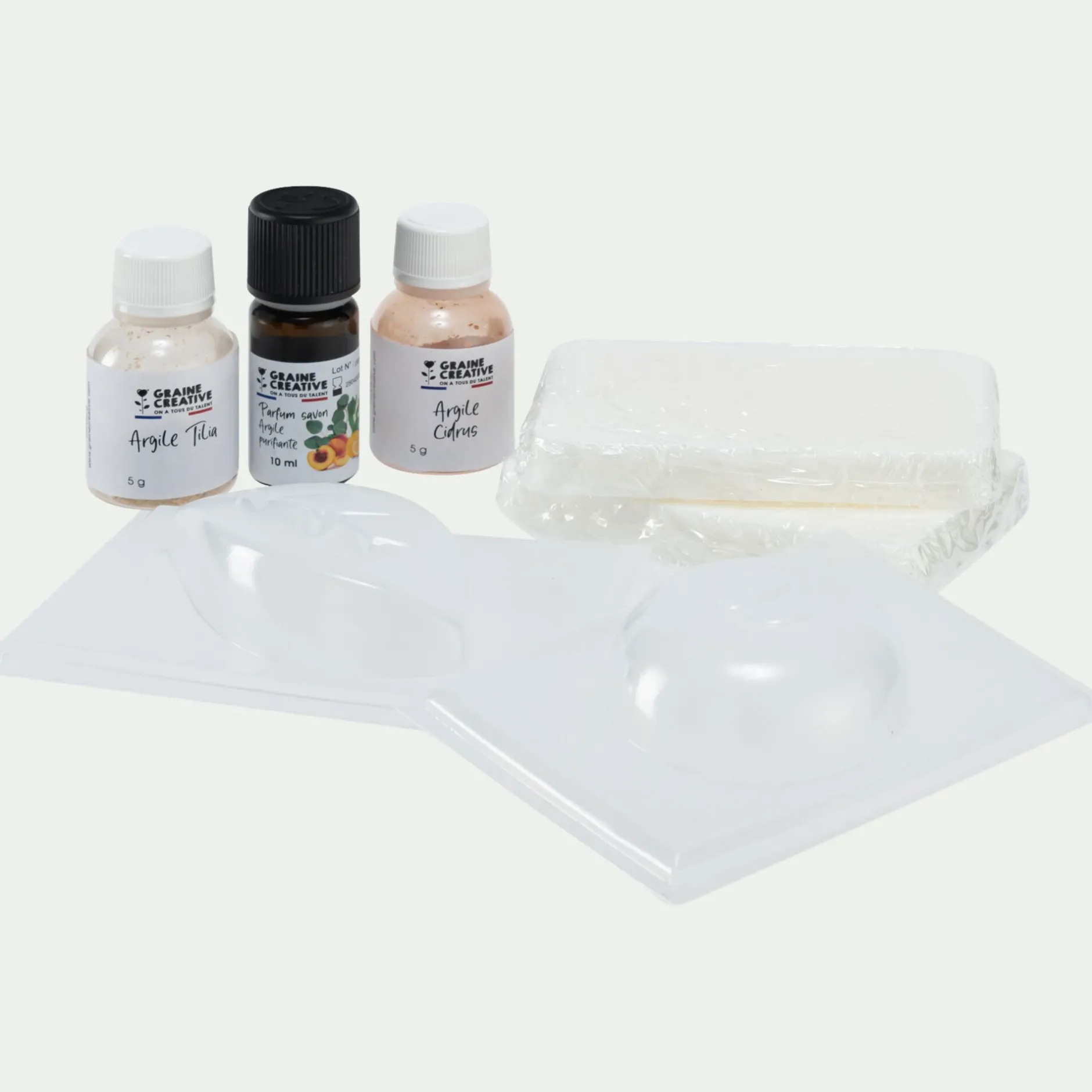 Contenu : 200g de savon, 2 moules, 2 flacons de poudre d’argile (5g), 1 parfum (10ml) et 1 notice illustrée.
