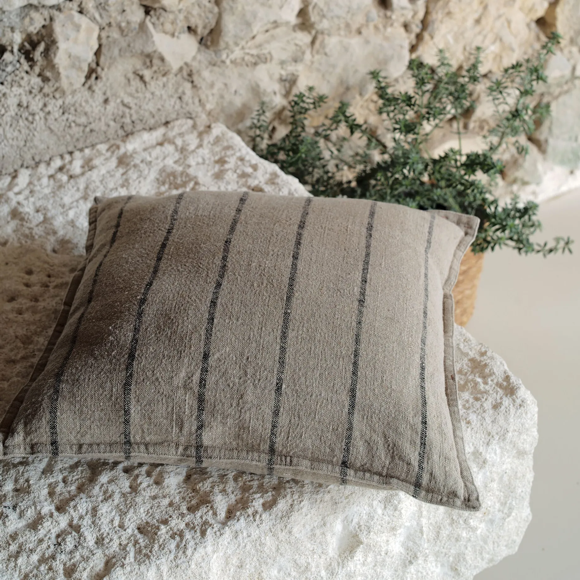Apportez une généreuse touche de confort à un fauteuil grâce au coussin Telo de 65×65 cm. Ce grand coussin carré se caractérise par une housse en lin. Ce coussin en lin arbore un coloris beige, rehaussé par de fines rayures noires. Ce motif intemporel participe à une décoration élégante et passe-partout, au bord de mer comme à la montagne.