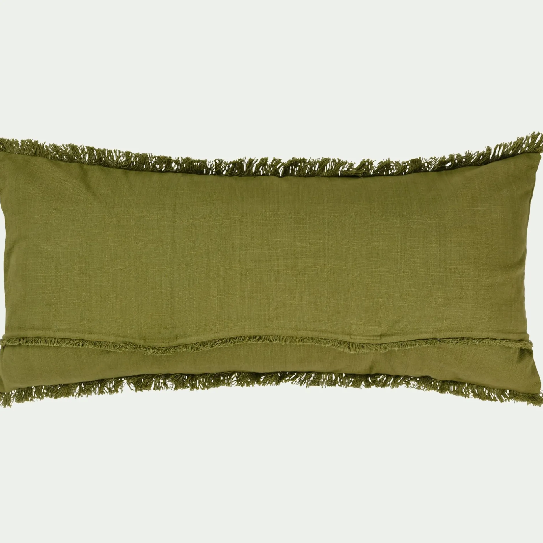 Apportez une touche de couleur à votre décoration avec ce grand coussin rectangulaire de 40×90 cm. Ce coussin déco nous séduit par ses formes généreuses et son vert profond. Cette nuance, appelée vert garrigue, participe à une atmosphère puissante et rassurante. Véritable anti-stress, le vert crée un sentiment de confort et de détente bienvenue dans le séjour. Ce coussin vert se compose d’une housse en coton et d’un garnissage moelleux. De courtes franges viennent souligner ses courbes et lui apporter fraîcheur et vitalité.