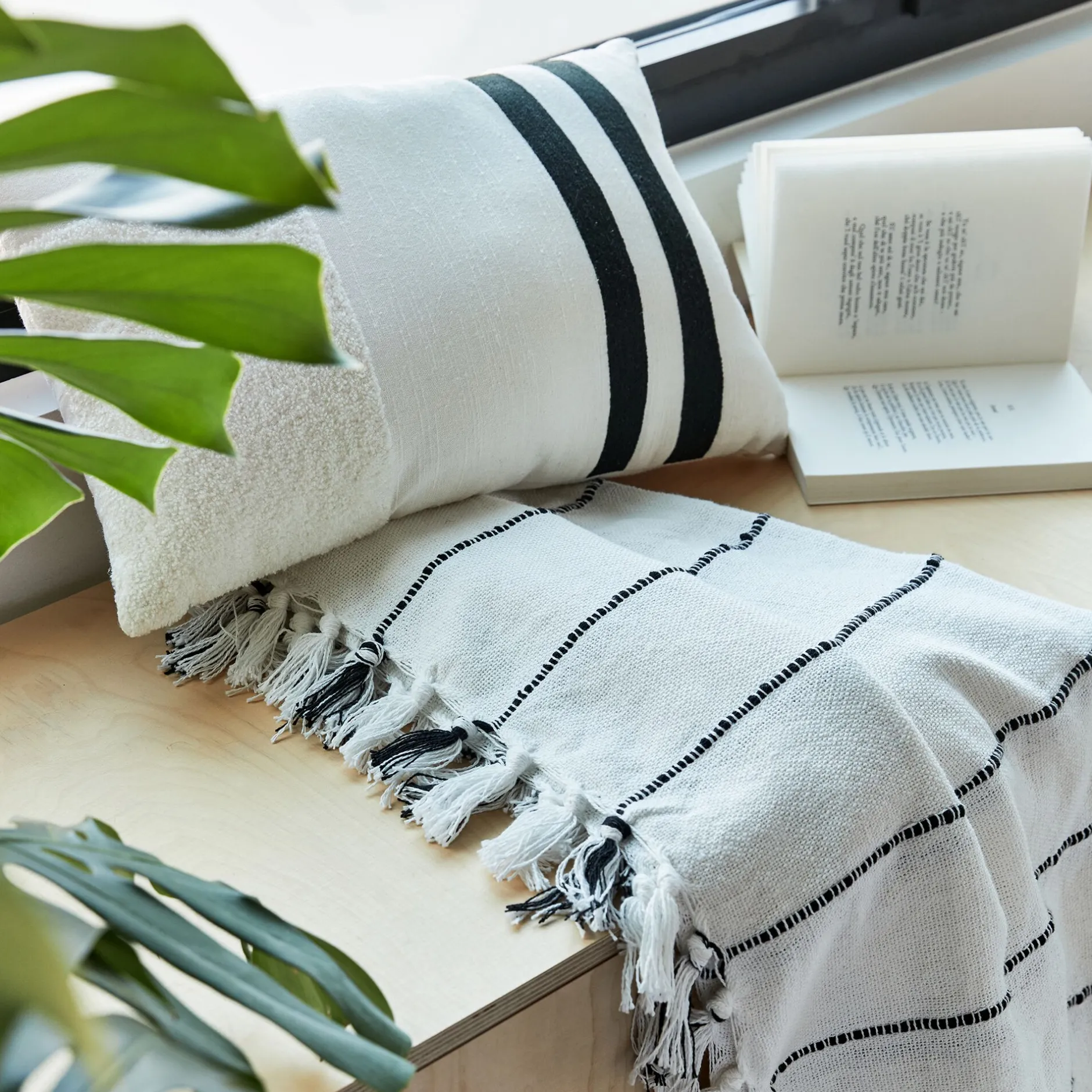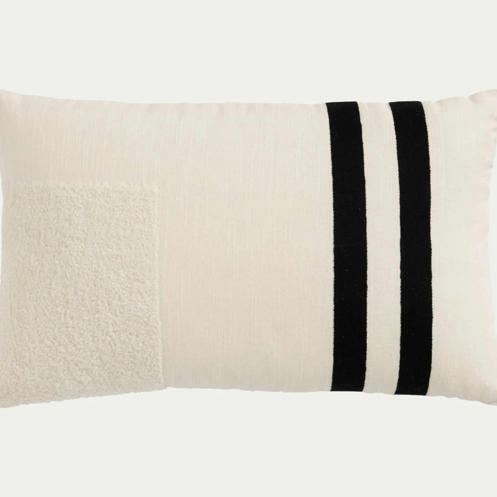 A la fois confortable et décoratif, le coussin Tilva est parfait sur votre canapé. Ce coussin rectangulaire se compose d’une housse 100% coton et d’un garnissage épais adapté. Déhoussable, ce coussin déco se lave aisément en machine. Il arbore une couleur lumineuse et intemporelle : le blanc. Cette tonalité éclatante s’associe à tous les types de décoration. Cette belle housse est ponctuée de deux épaisses rayures noires, un détail simple qui permet de jouer le contraste. Ce coussin rayé présente une finition tuftée sur un angle, un effet moutonné qui apporte de la texture à l’ensemble. Ce coussin à motifs de 30×50 cm vous accompagne lors de vos moments de détente pour un plaisir décuplé.