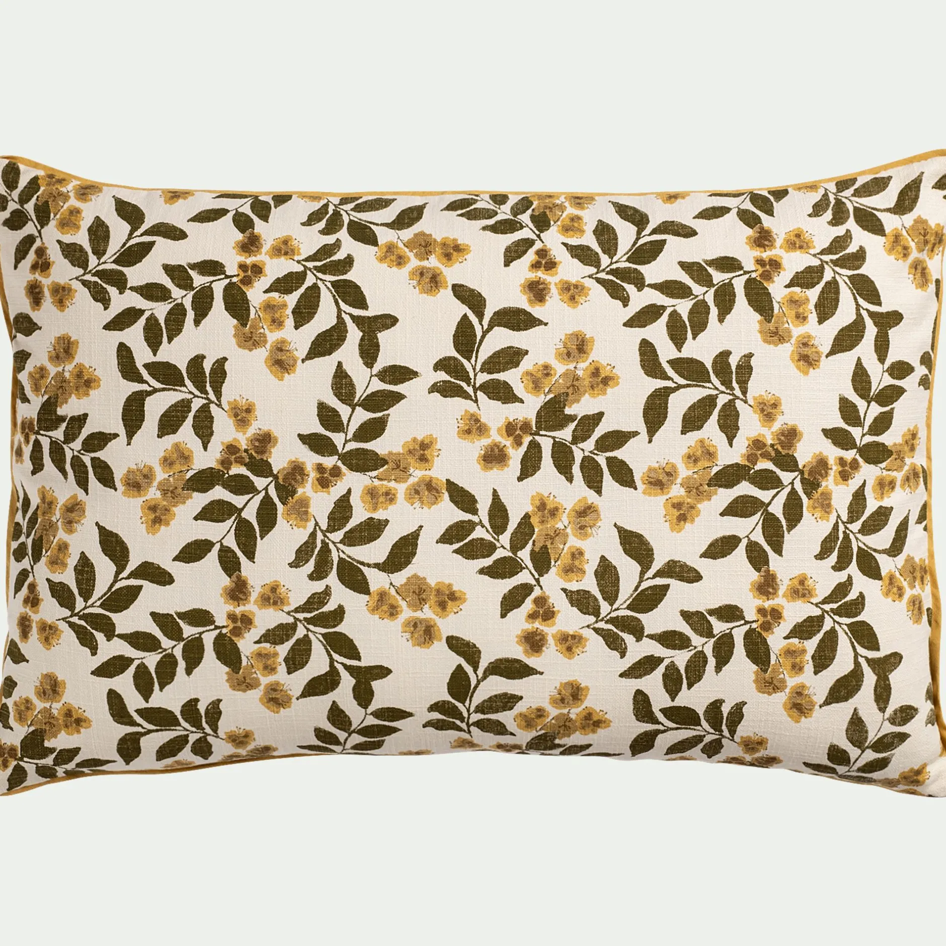 Le coussin Hoa évoque la fraîcheur d’un jardin en fleurs. Sur sa housse en coton blanc s’épanouissent de délicates petites fleurs jaunes et vertes, apportant une note colorée et vivante à la déco. Son format rectangulaire de 40×60 cm est souligné par un élégant volant plat, qui accentue son esprit champêtre et raffiné. Un joli détail pour égayer un canapé ou un lit avec douceur.