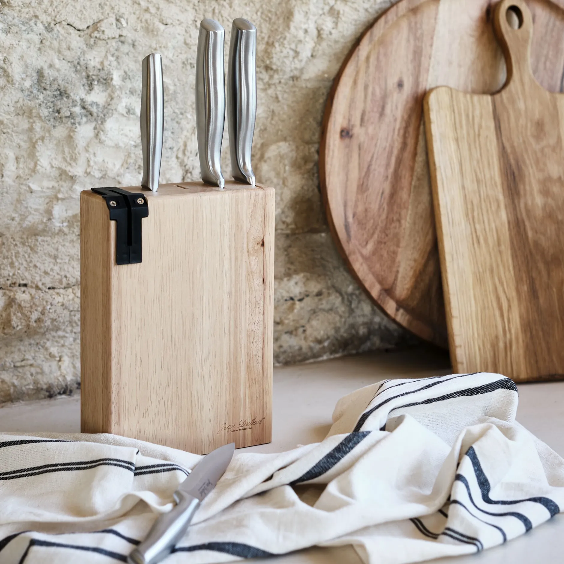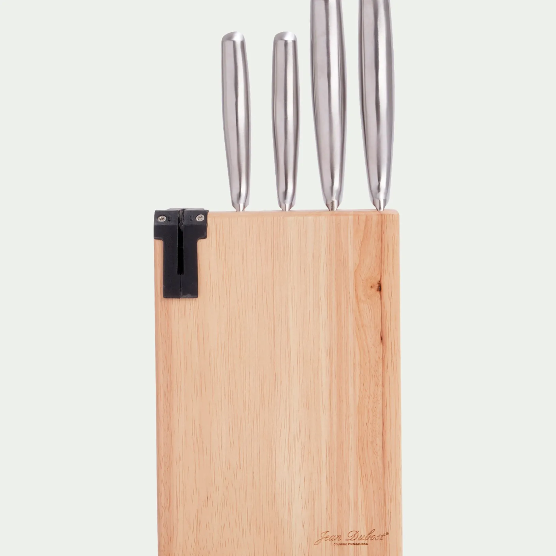 Bloc en hévéa et couteaux en acier inoxydable.