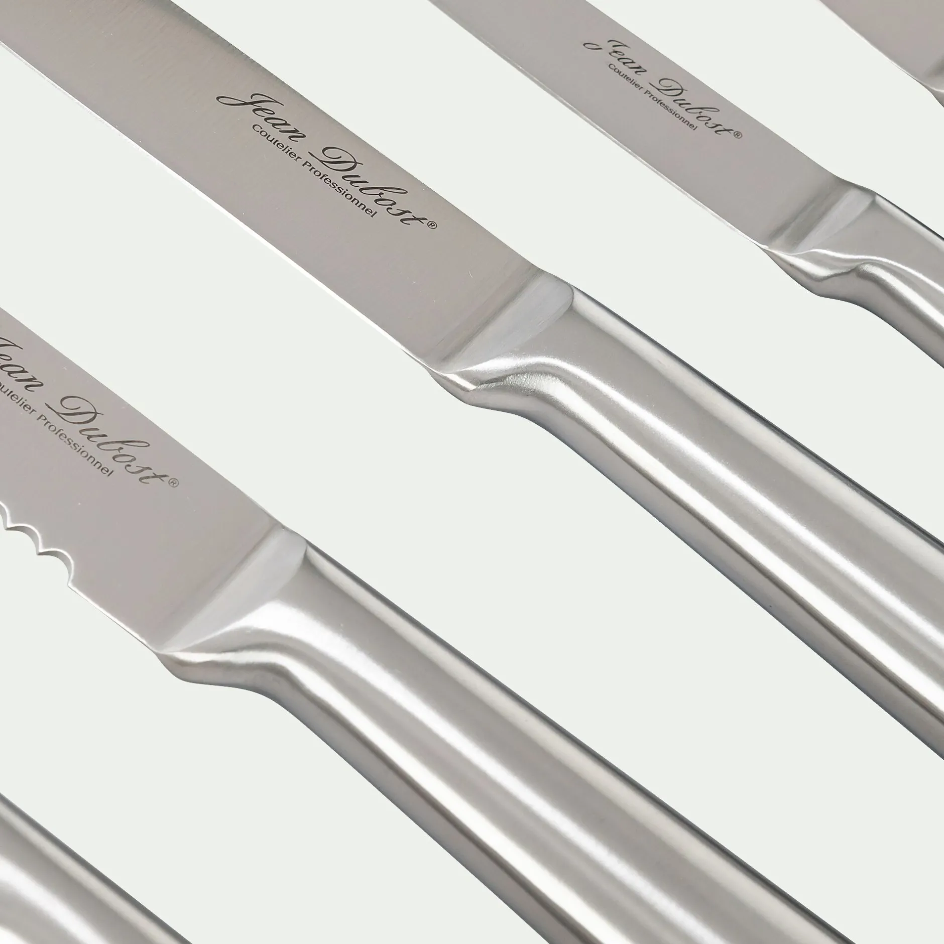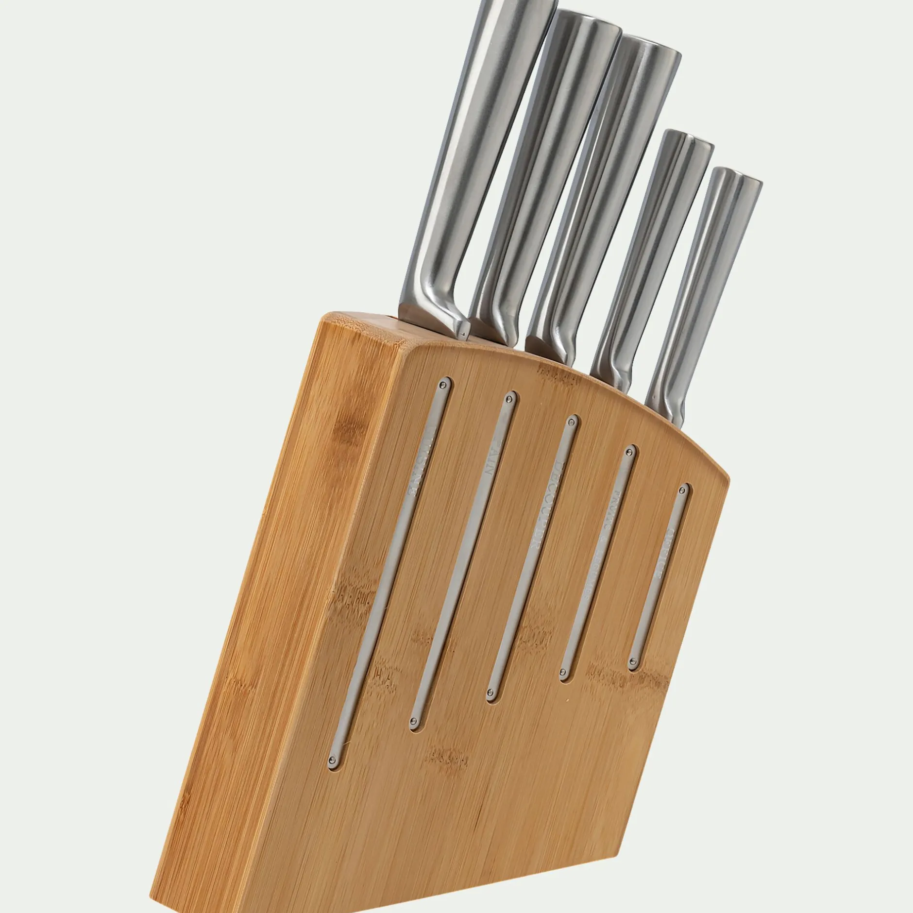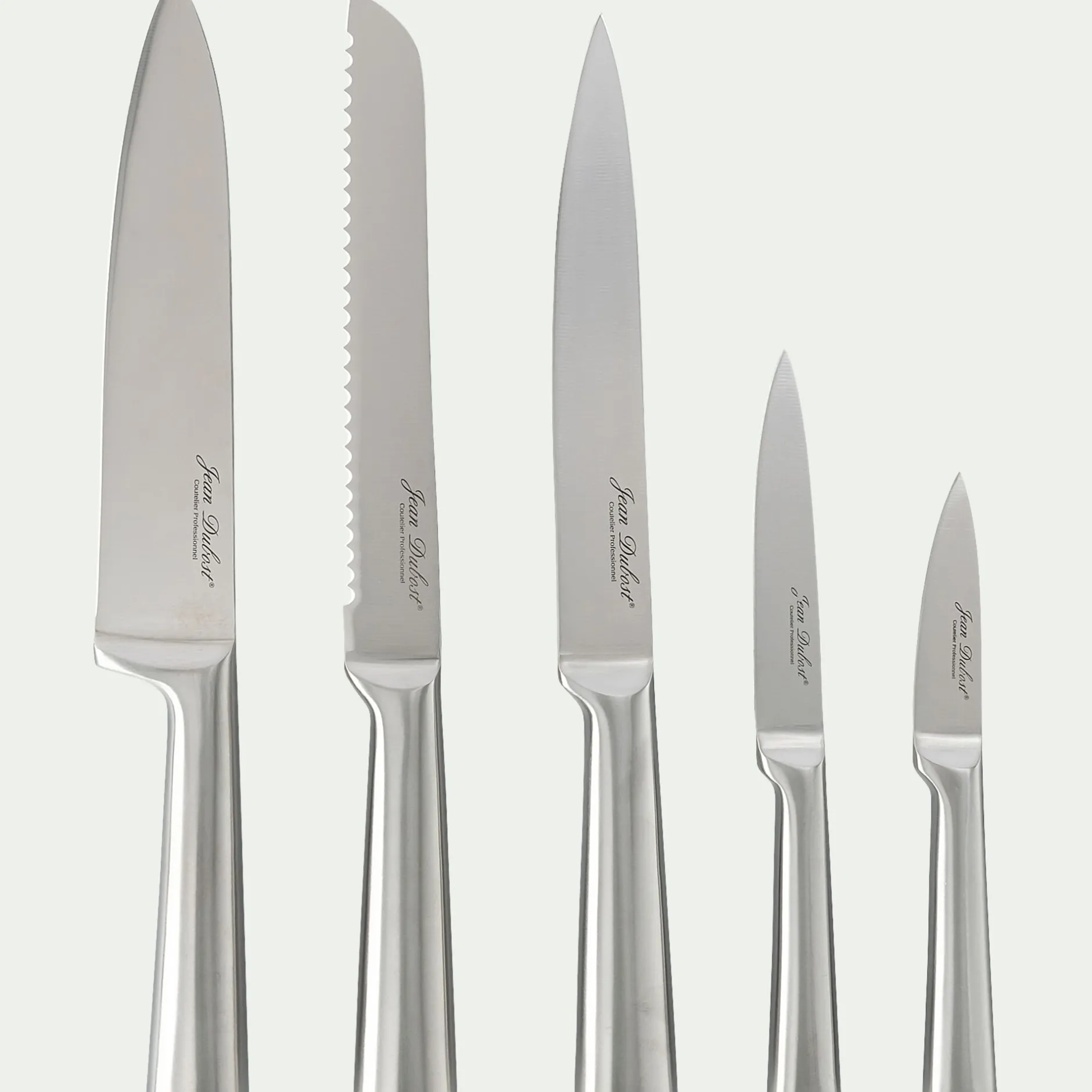 Ce bloc de couteaux polyvalent comprend cinq couteaux essentiels pour toutes vos tâches culinaires. L’office, parfait pour les tâches de précision telles que l’épluchage et le parage. Le couteau à fruits et légumes, idéal pour découper et trancher vos fruits et légumes avec facilité. Le couteau à découper, pour des coupes nettes et précises de viandes et de volailles. Le couteau à pain, doté d’une lame dentelée pour trancher uniformément les pains frais. Enfin, le couteau de cuisine polyvalent, adapté à une variété de tâches, du hachage des herbes au tranchage des viandes.
