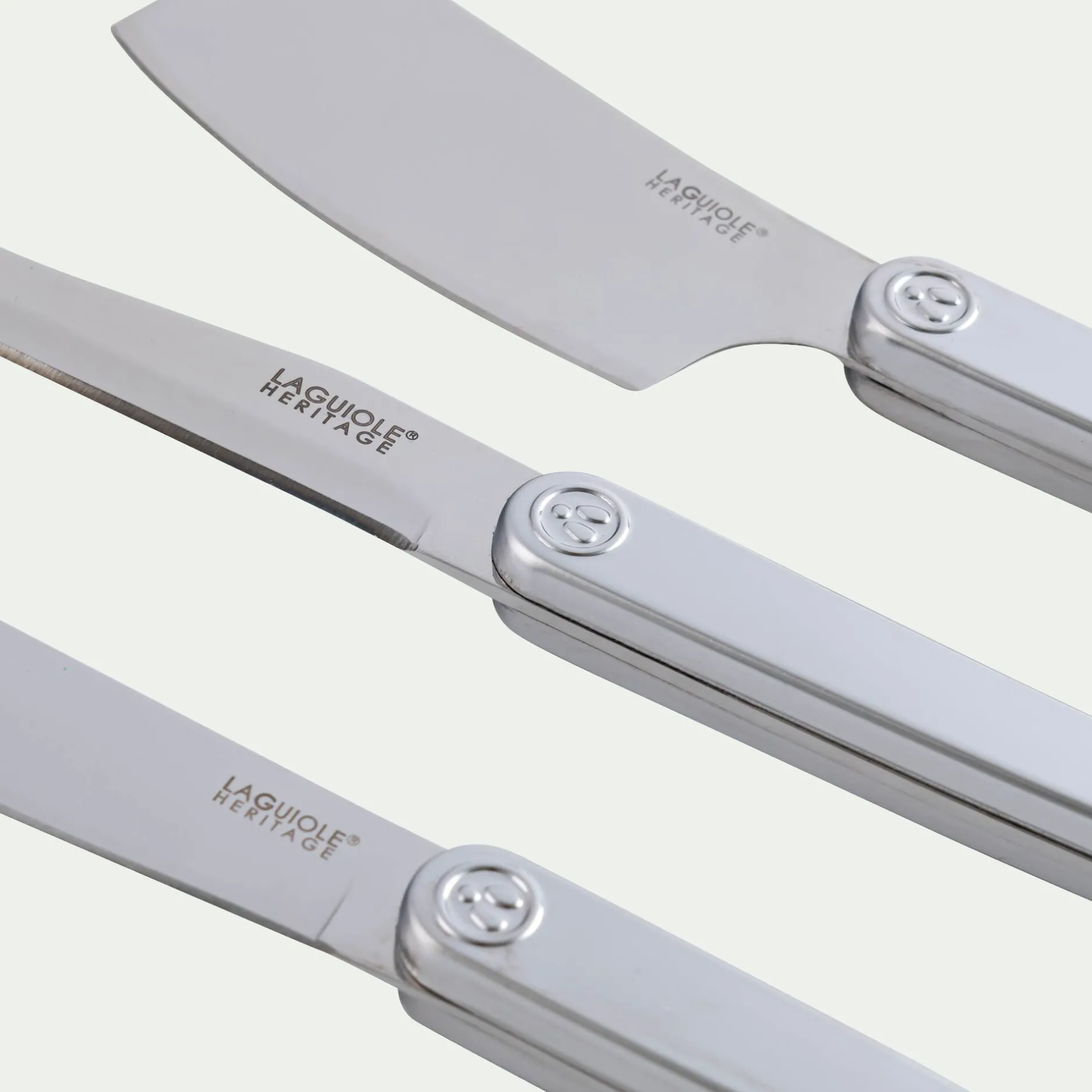 Ce lot de 3 couteaux à fromage signé Lagiole allie tradition et efficacité. Entièrement conçus en inox, manche et lame, ils garantissent solidité et durabilité. Le set comprend un couteau classique à lame lisse pour des tranches nettes, un couteau traditionnel à double pointe qui limite l’adhérence et facilite le service des fromages à pâte molle, ainsi qu’une hachette à lame large, idéale pour couper sans effort les pâtes dures. Un ensemble pratique et raffiné, pensé pour sublimer chaque dégustation de fromage.