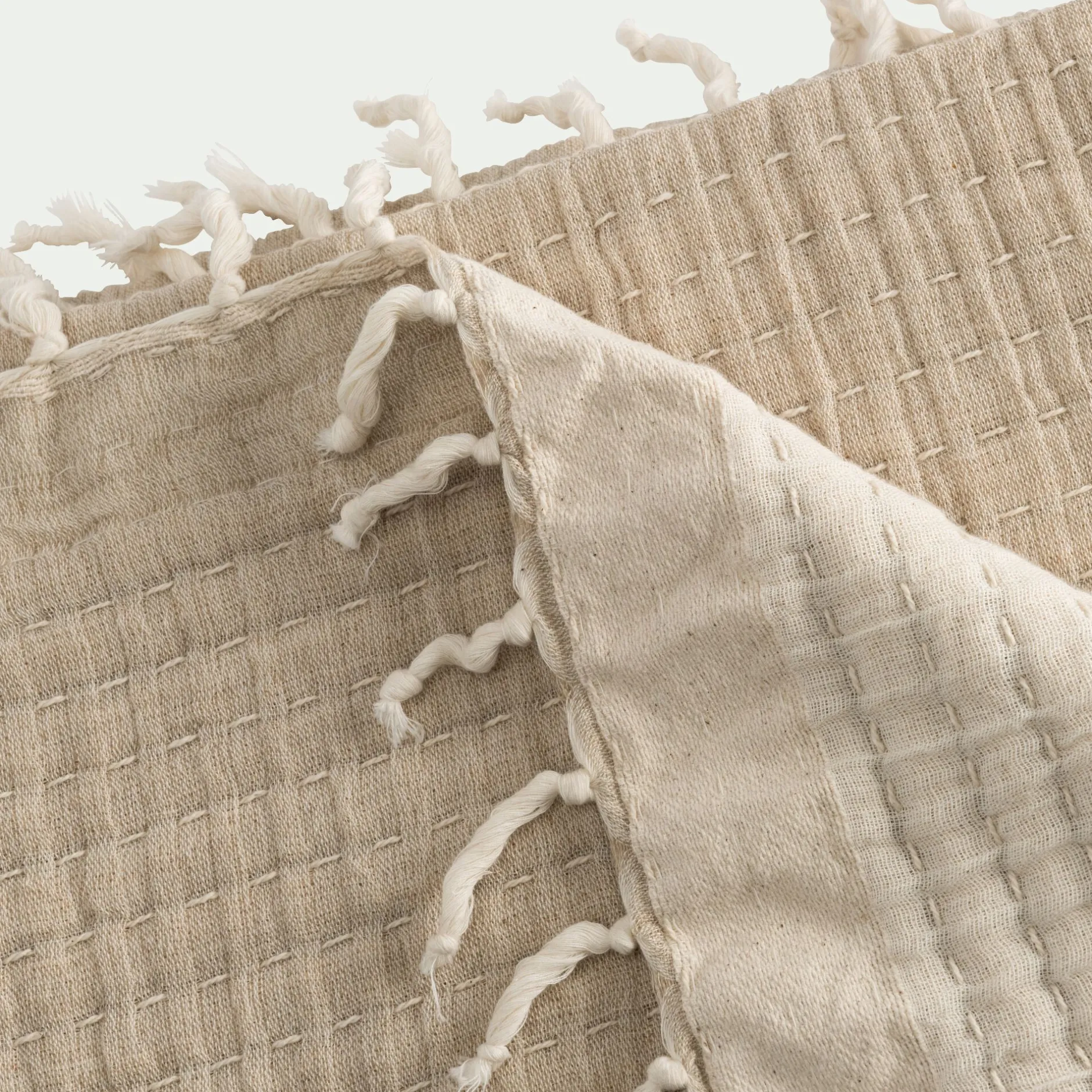 Khanta est un couvre-lit en coton, avec des finitions légères et raffinées. Sur son étoffe, quelques détails en double gaze de coton ainsi qu’une surpiqûre blanche viennent apporter de la texture et du contraste. Ce couvre-lit beige est également orné de deux côtés frangés et de deux côtés effilochés. Touche de confort supplémentaire sur votre lit, ce grand plaid de 230×250 cm accompagne vos nuits de sa douceur et vos journées de sa beauté.