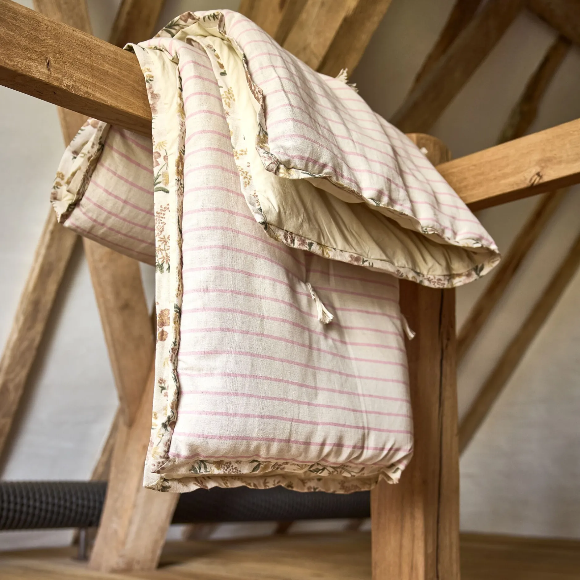 Apportez une touche décorative et cosy à votre chambre à coucher avec cet édredon de 100×180 cm. Placé sur le lit, il ajoute du volume et du confort tout en insufflant une ambiance douce et joyeuse. Son recto arbore de charmantes rayures roses, tandis que son verso uni est délicatement rehaussé de petites fleurs sur les bords. Confectionné principalement en coton, il se distingue également par une élégante finition ornée de pompons.