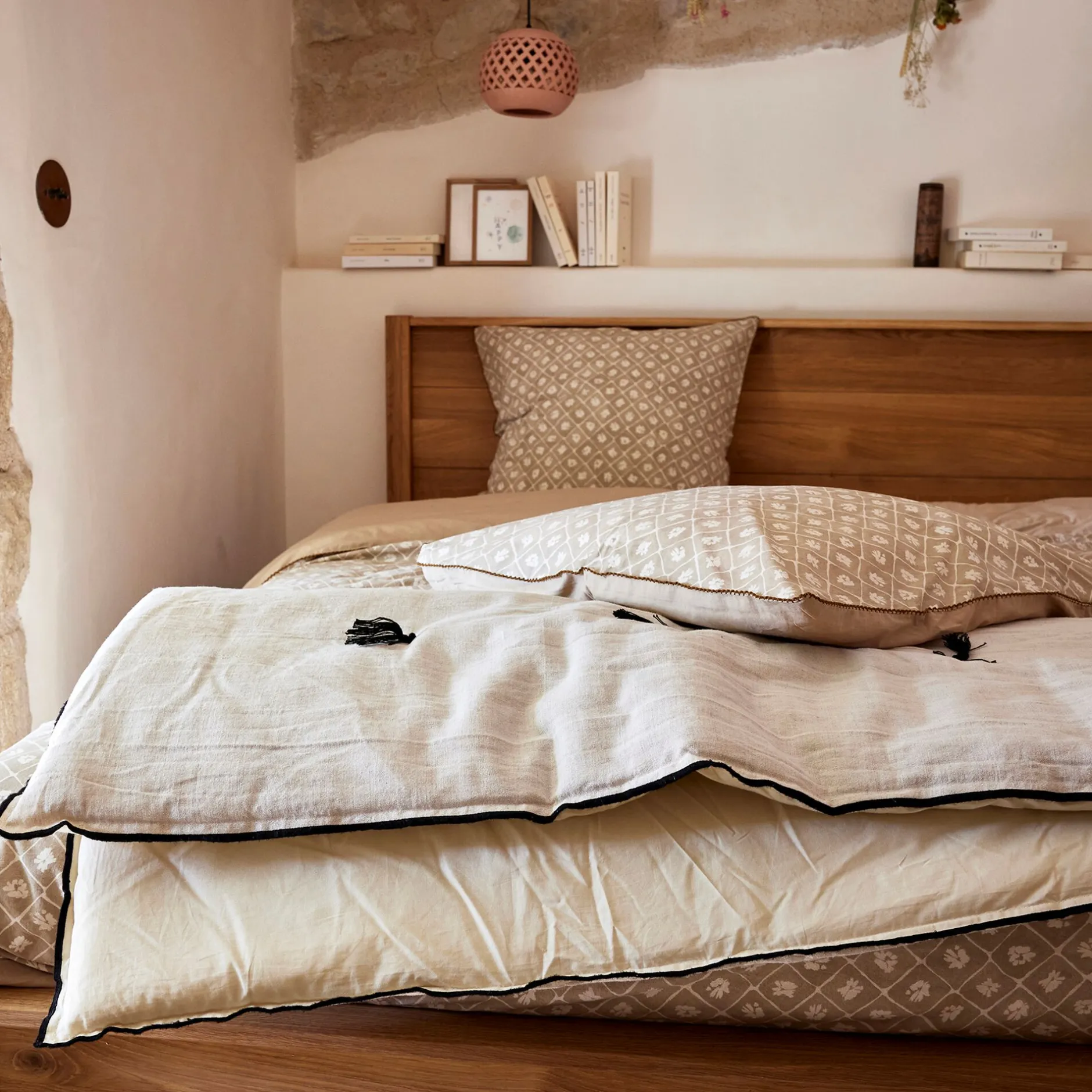 L’édredon Elina, d’un blanc écru naturel et lumineux, est un accessoire incontournable lorsque l’on souhaite se créer un coin douillet. Tissé en coton et lin, cet édredon apportera à la fois une touche déco à votre lit ainsi qu’un peu de chaleur durant les nuits d’hiver. Moelleux et confortable, cet édredon dispose d’un gonflant inimitable grâce à ses 5cm d’épaisseur. Invitation à la paresse, sa robe blanche arbore des détails en passepoil noirs : une garniture en relief située sur les bordures pour souligner les traits de l’édredon. Ce fin liseré est accompagné de quelques pompons noirs pour une touche fantaisiste et bohème qui apporte contraste et caractère à cet édredon blanc.