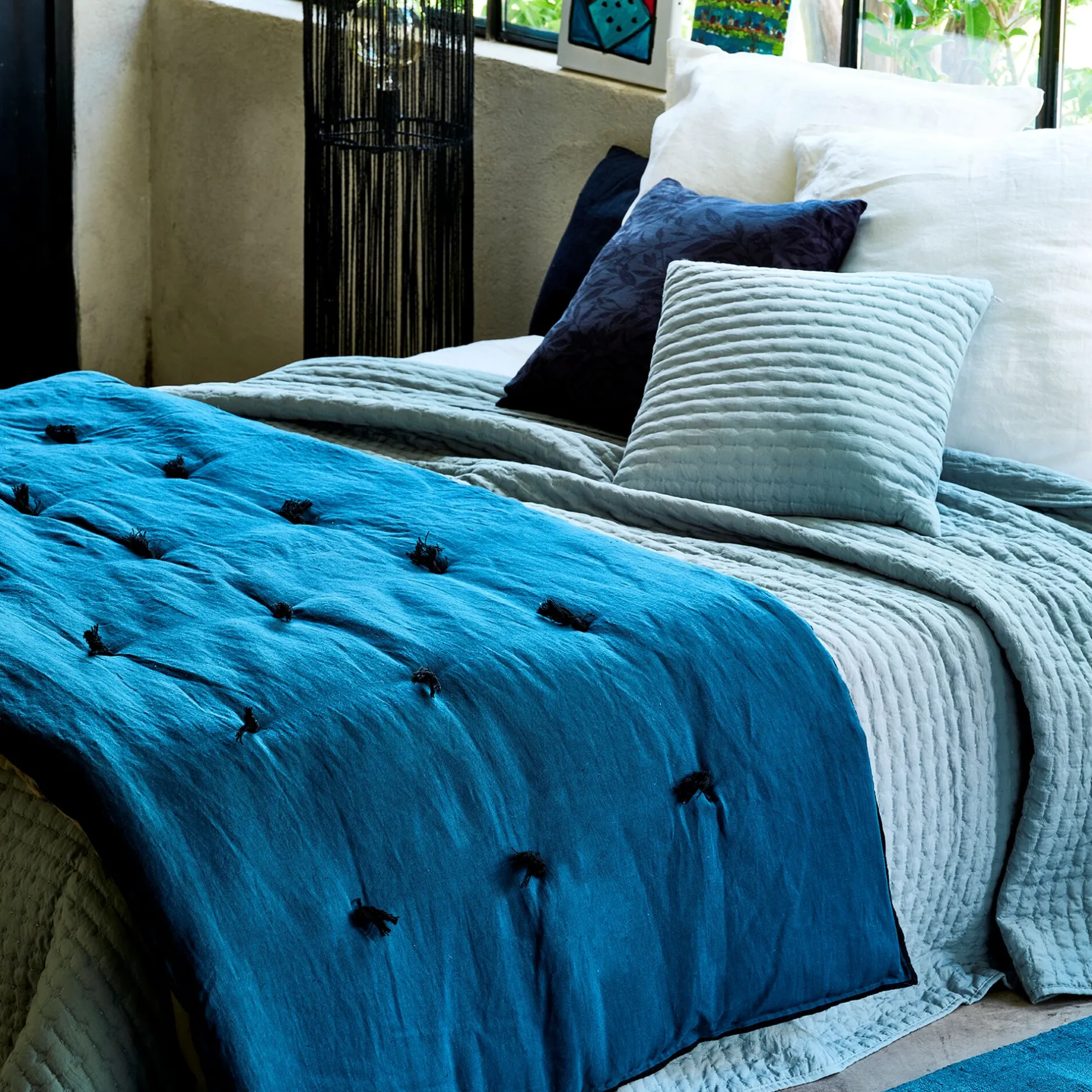 Couvre-Lit*alinea Édredon en lin et coton 100x180cm piquage pompons – figuerolles Bleu