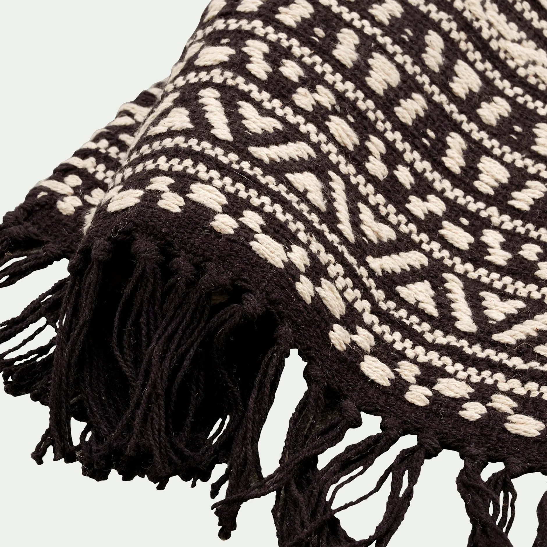 Ce petit tapis blanc aux motifs noirs offre un puissant contraste. Ces deux couleurs, neutres et sophistiquées, se marient à merveille dans des formes atypiques : ce tapis porte en lui l’élégance de l’intemporel mais aussi une certaine forme de décontraction. Ses motifs aztèques sont inspirés de la culture amédindienne. Lignes, zigzags et triangles sont tissés à partir de coton. Ce tapis souple arbore de belles franges qui valorisent la matière et confèrent au textile un esprit ethnique. 100% coton et de léger (600g), le tapis Ossa passe aisément en machine pour un entretien facilité. De petite taille (60x90cm), il convient particulièrement à une chambre à coucher, comme descente de lit graphique pour apporter une touche de vitalité et de modernité à votre pièce.
