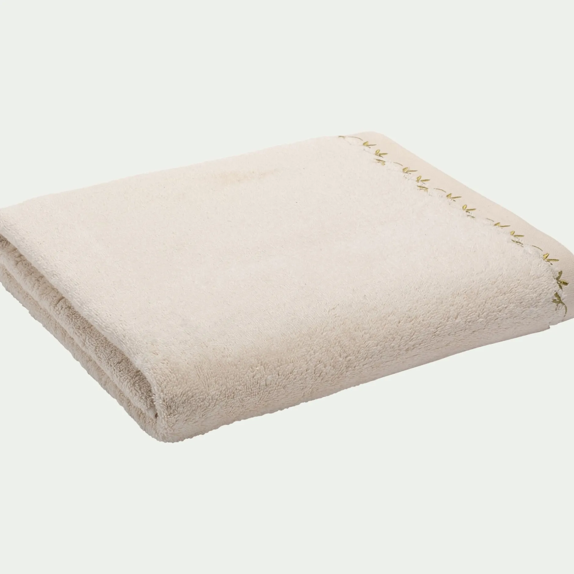 Découvrez le summum du confort et du raffinement avec ce drap de bain, conçu pour envelopper votre corps dans un cocon de douceur après chaque douche. Avec son élégant ton beige et sa délicate broderie verte, il ajoute une note de sophistication à votre espace de bain. Fabriqué en coton certifié Oeko-Tex®, ce drap de bain marie à la perfection résistance et douceur pour une expérience des plus agréables. Indispensable dans votre routine de bain, ce drap de bain s’adapte à tous les styles d’intérieur. Explorez la gamme complète pour créer un ensemble harmonieux : du drap de douche au gant de toilette, en passant par les serviettes d’invité, chaque pièce vous invite à vous envelopper de luxe et de bien-être. Redécouvrez le plaisir du bain avec ce drap de bain d’exception, où la qualité et l’élégance se conjuguent pour vous offrir un moment de détente incomparable.