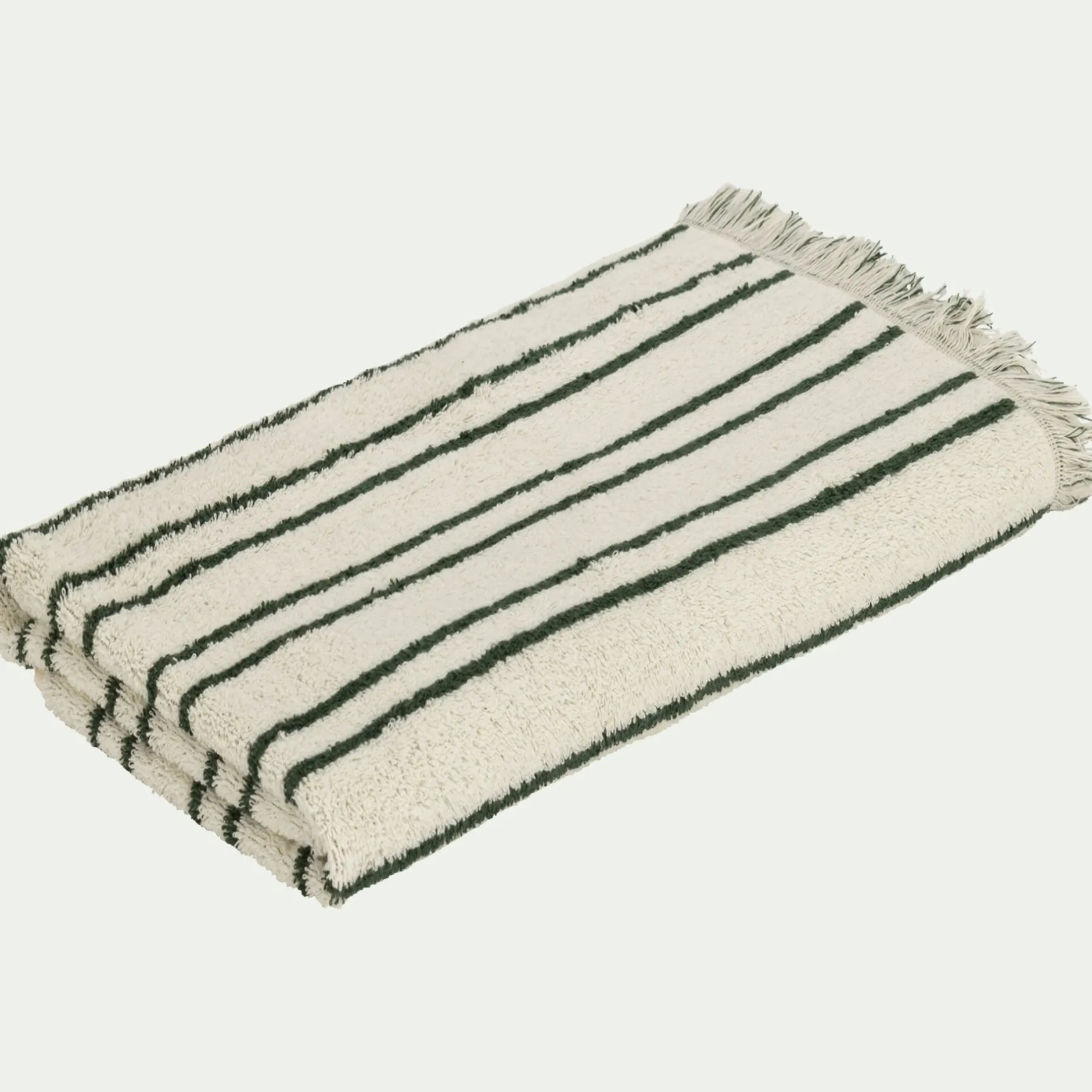 Découvrez la gamme de linge de toilette Listra, une collection sophistiquée conçue au Portugal. Voici le drap de douche vert à rayures blanches, source de douceur exceptionnelle jour après jour. Avec ses dimensions de 70×140 cm et son grammage généreux, cette serviette vous enveloppe confortablement et assure un séchage rapide après chaque douche. Composée principalement de coton recyclé certifié Oeko-Tex, cette serviette de douche s’intégrera facilement à votre intérieur. Parcourez le reste de la collection pour assembler un ensemble harmonieux de linge de toilette.