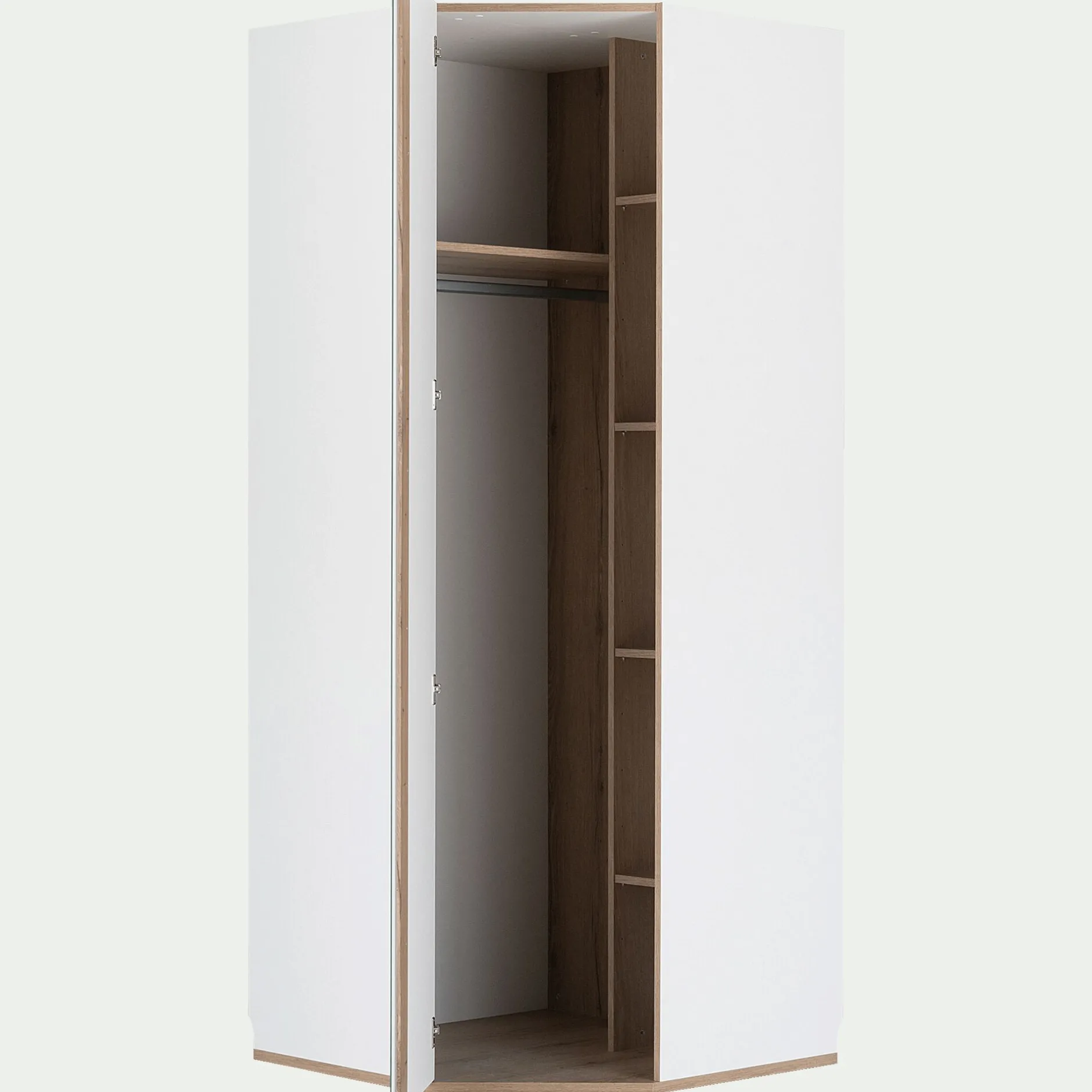 Ici, nous vous présentons le dressing d’angle, de couleur blanche, que vous pouvez aisément intégrer à votre chambre à coucher. Vous pouvez acheter cette pièce seule ou associée à un des éléments de la gamme. Chaque module est indépendant, mais ils se complètent aussi parfaitement entre eux. Ce sont des produits de qualité qui vous sont proposés, avec une finition en mélanine et une impression effet bois au toucher. Résistants, ces meubles dureront dans le temps. Le montage de ces derniers est très aisé et se fait en vertical. Les coins des modules sont découpés afin de laisser passer les plinthes et que vous puissiez placer vos meubles contre le mur.