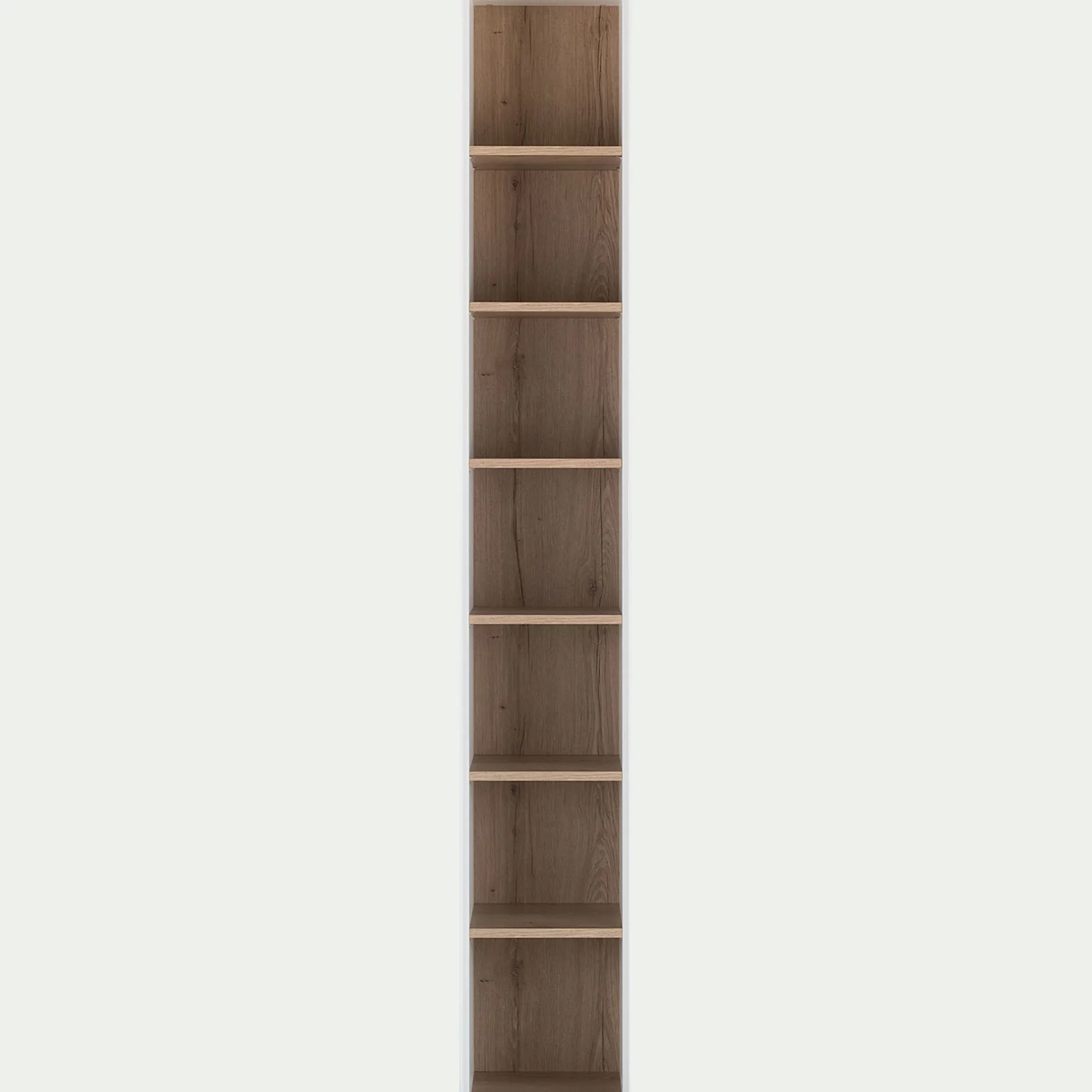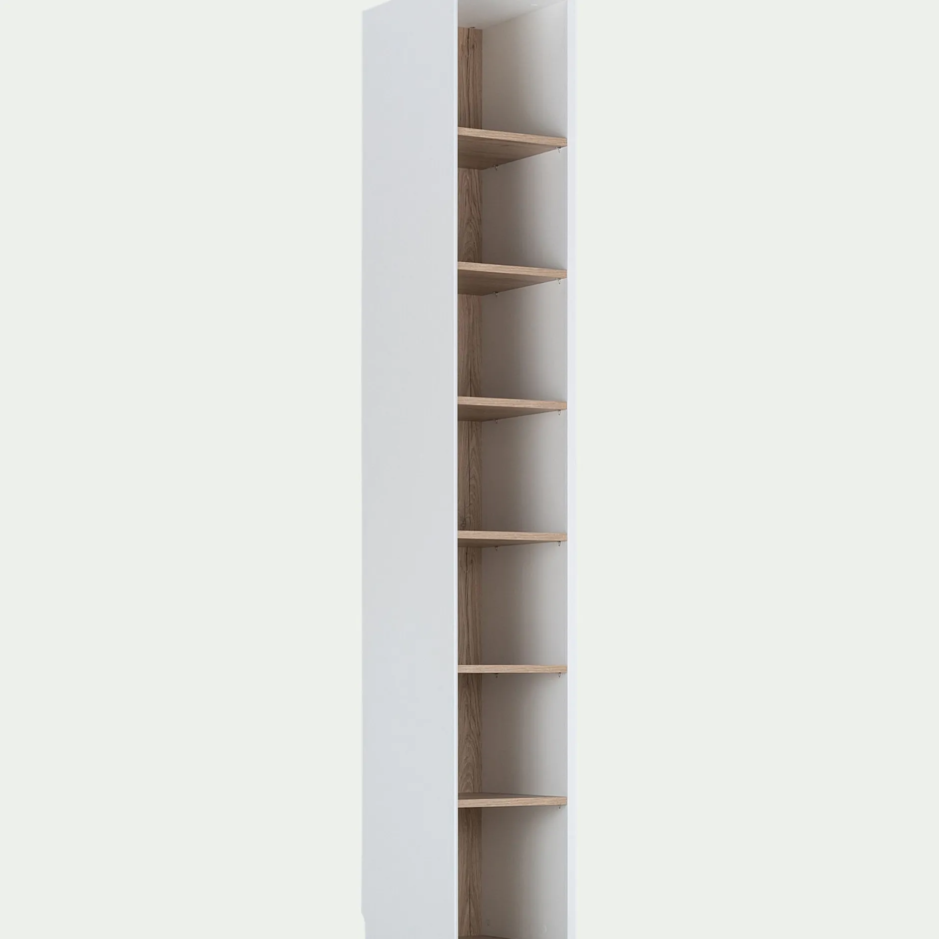 Une bibliothèque blanche où vous pouvez exposer vos affaires et décorations. Vous pouvez utiliser cette pièce seule ou l’associer à un des éléments de la gamme. Chaque module est indépendant et parfaitement complémentaire avec les autres élèments de la gamme. Avec une finition en mélanine et une impression effet bois au toucher, le style et la qualité sont au rendez vous. Résistants, ces meubles durent dans le temps. Le montage de ces derniers est aisé et se fait verticalement. Les coins des modules sont découpés afin de laisser passer les plinthes pour que vous puissiez placer vos meubles contre le mur.