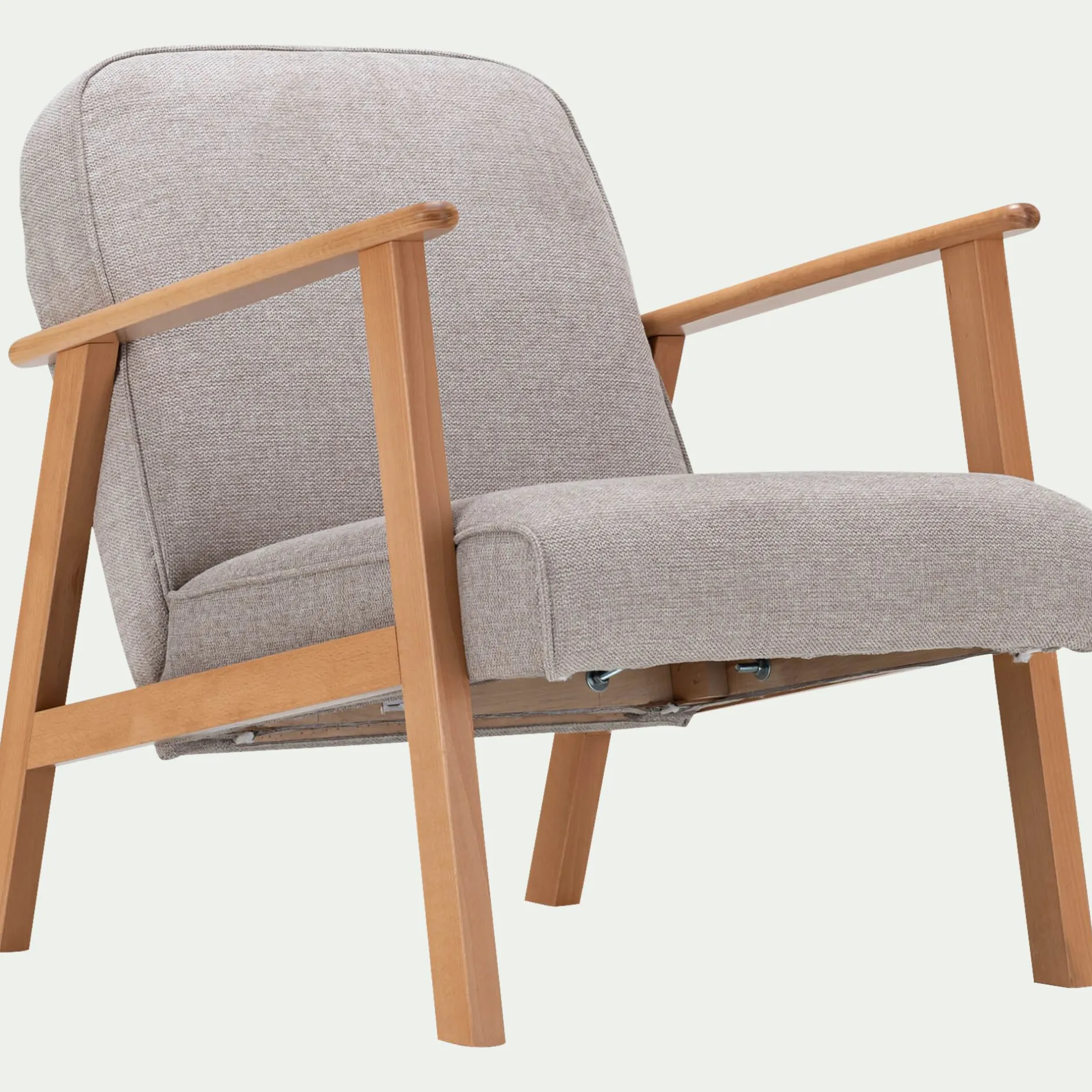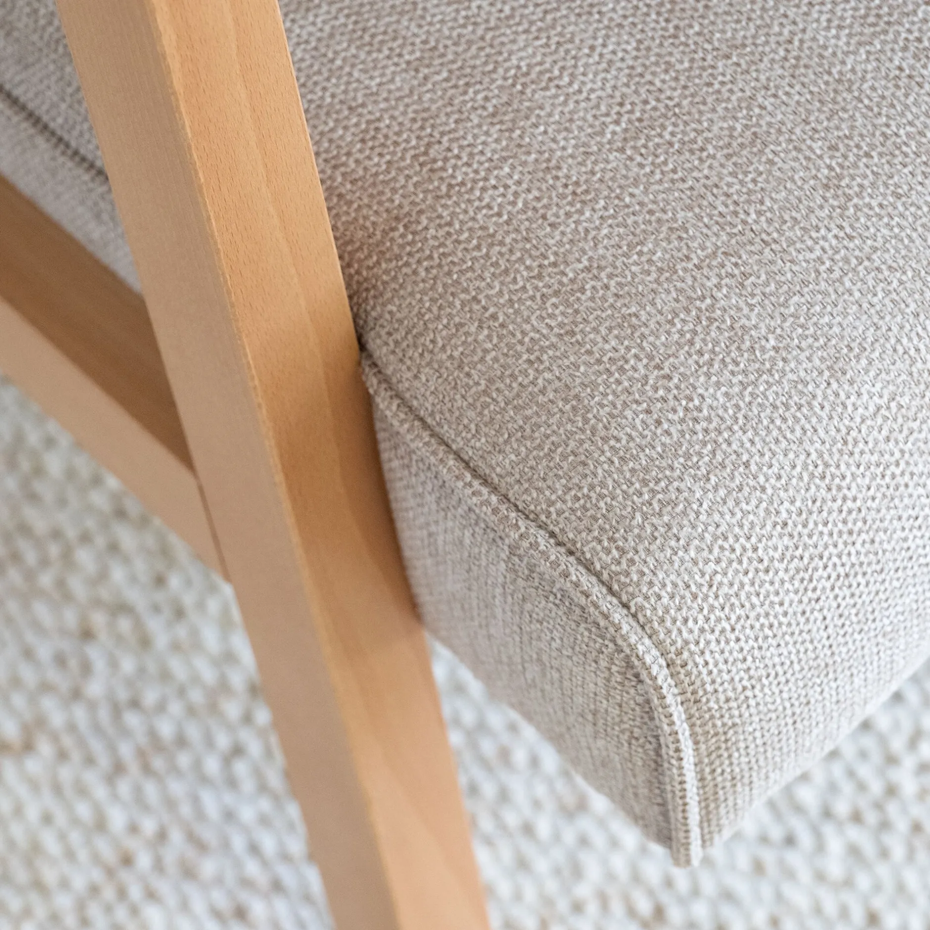 Avec son tissu beige roucas, doux et naturel, ce fauteuil invite à la détente. Son assise généreuse et son dossier rembourré offrent un confort idéal pour les moments de repos. Deux accoudoirs viennent compléter la silhouette enveloppante, tandis que le piètement en hêtre apporte une touche authentique et chaleureuse. Un fauteuil en tissu pensé pour le salon, entre style apaisant et bien-être au quotidien.