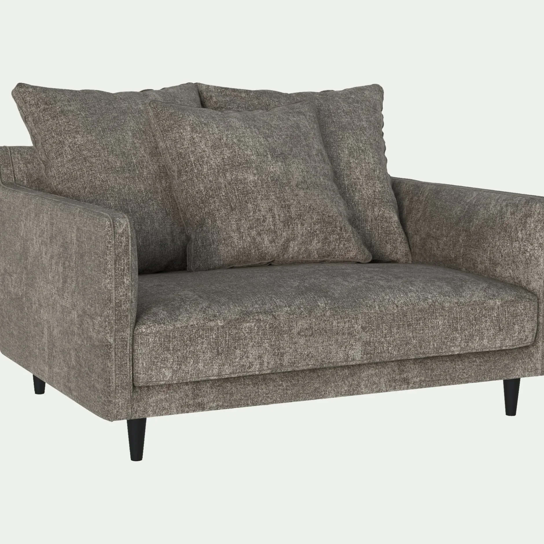 Assise et dossier : Assise en mousse polyurethane densité 30kg/m3 et couette en fibre polyester. Coussins dossier garnissage plumes d’oie et fibre polyester, 2 coussins de dos 60x60cm et 1 coussin 50x50cm.