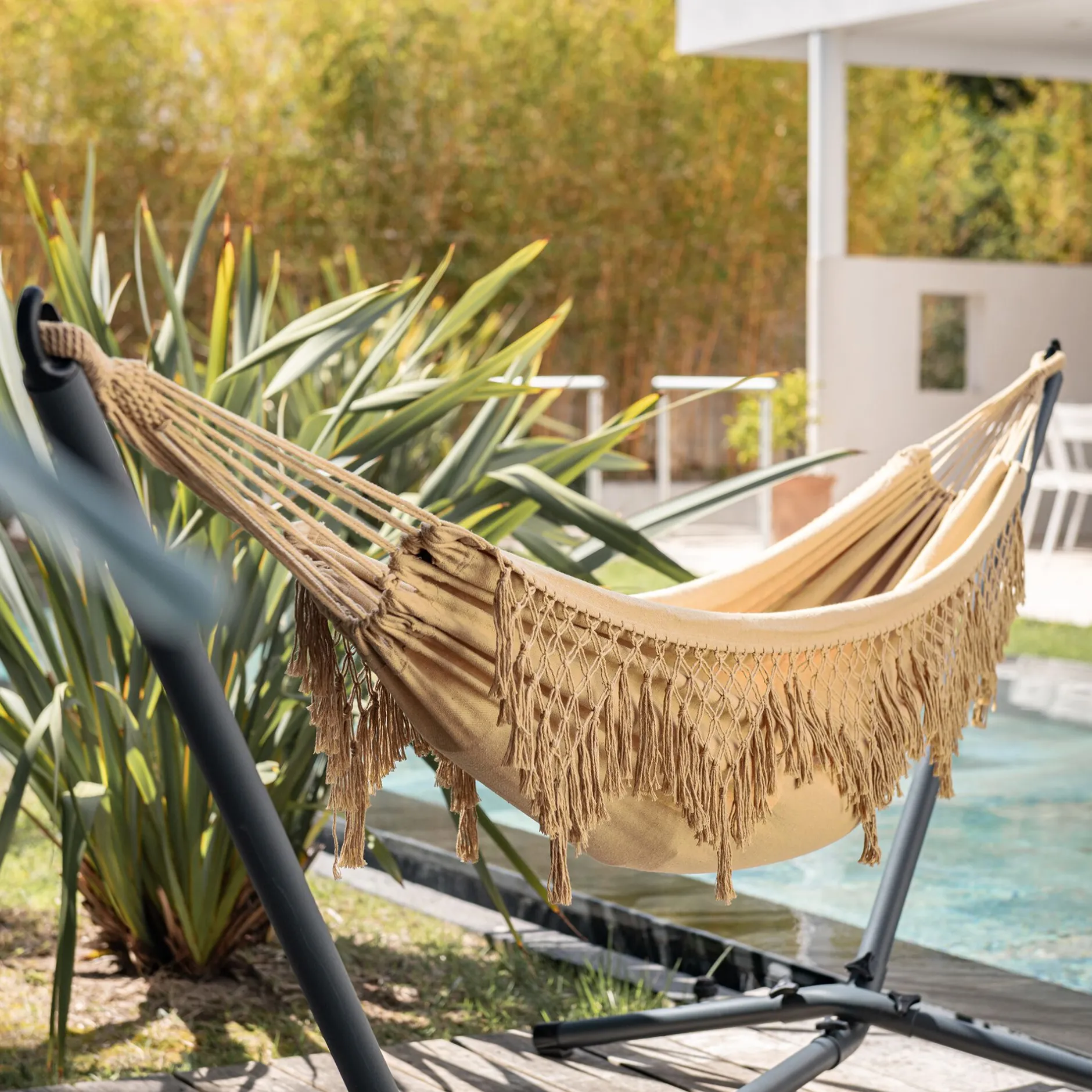 Puglia est le nom italien pour la région des Pouilles, région côtière où la mer est azur, les façades des maisons blanches sont baignées de soleil, le temps s’est arrêté pour des vacances… Un air de dolce vita s’invite à la maison avec ce hamac. Il suffit de se laisser bercer et de profiter d’une sieste confortable dans un tissu en polycoton qui laisse respirer. Le charme du hamac Puglia réside dans sa couleur beige nèfle, ainsi que dans ses franges qui en font un hamac aux finitions soignées.