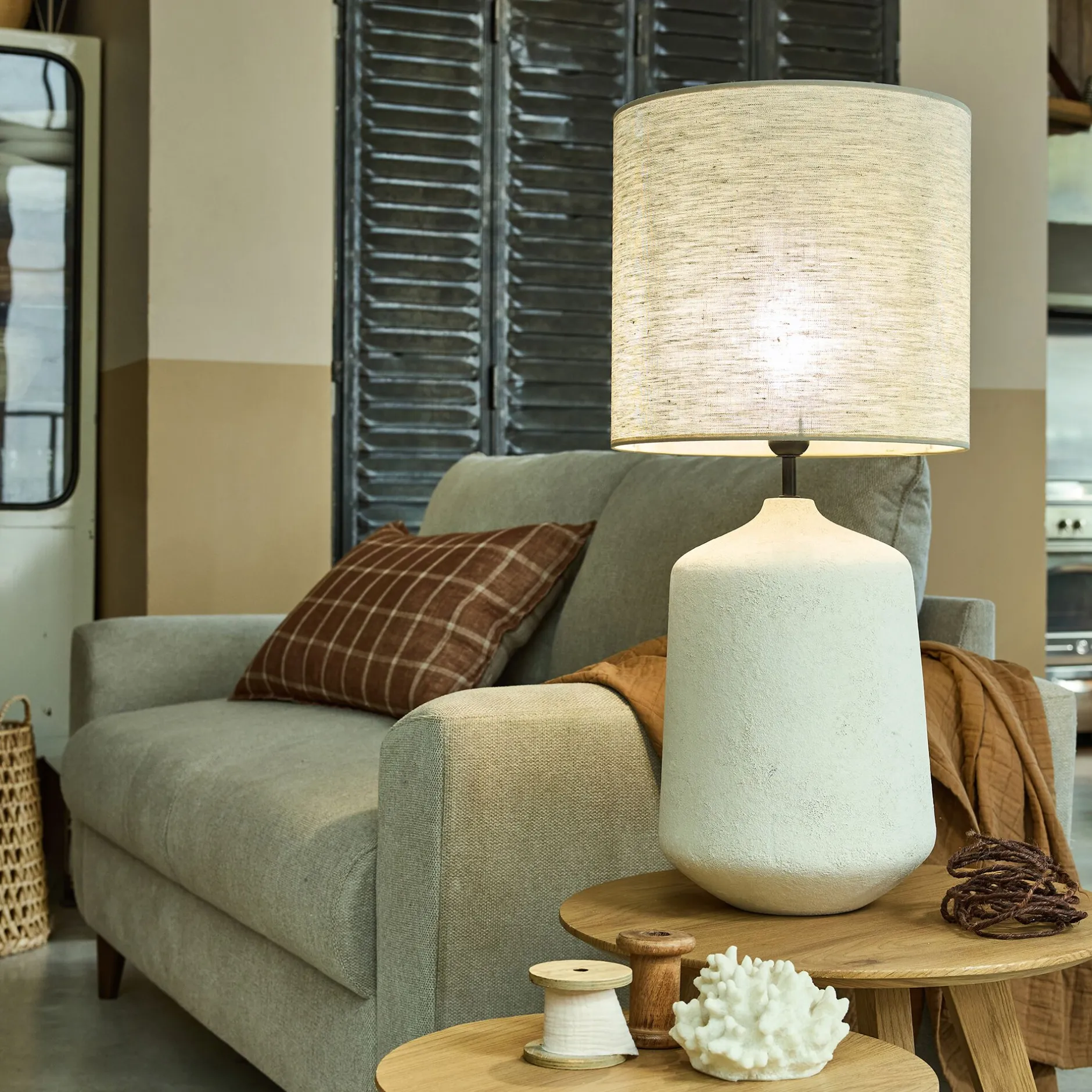 Céramique et abat-jour en coton.